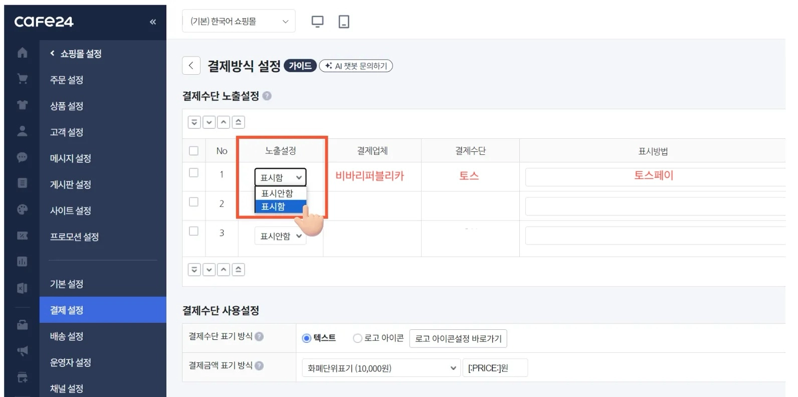 결제 업체 - 토스페이 항목을 '표시함'으로 설정하기