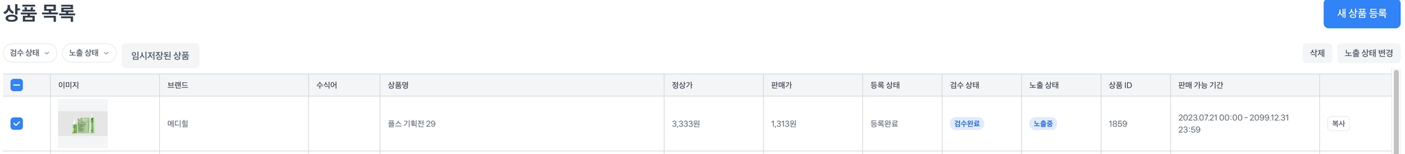 신규 상품을 등록하는 경우, 상품 목록 우측 상단의 새 상품 등록 버튼을 통해 등록을 진행해주세요.