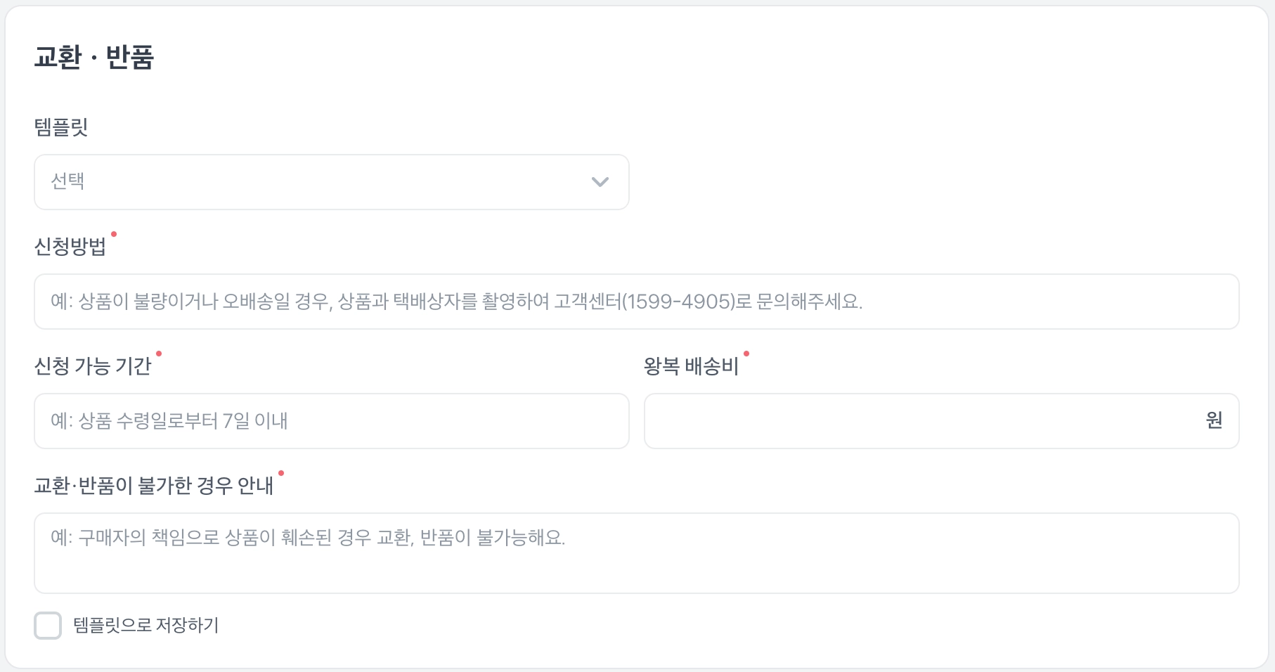 기존에 등록한 상품과 교환/반품 정보가 동일하다면, 템플릿 선택을 통해 동일한 정보를 채울 수 있어요.