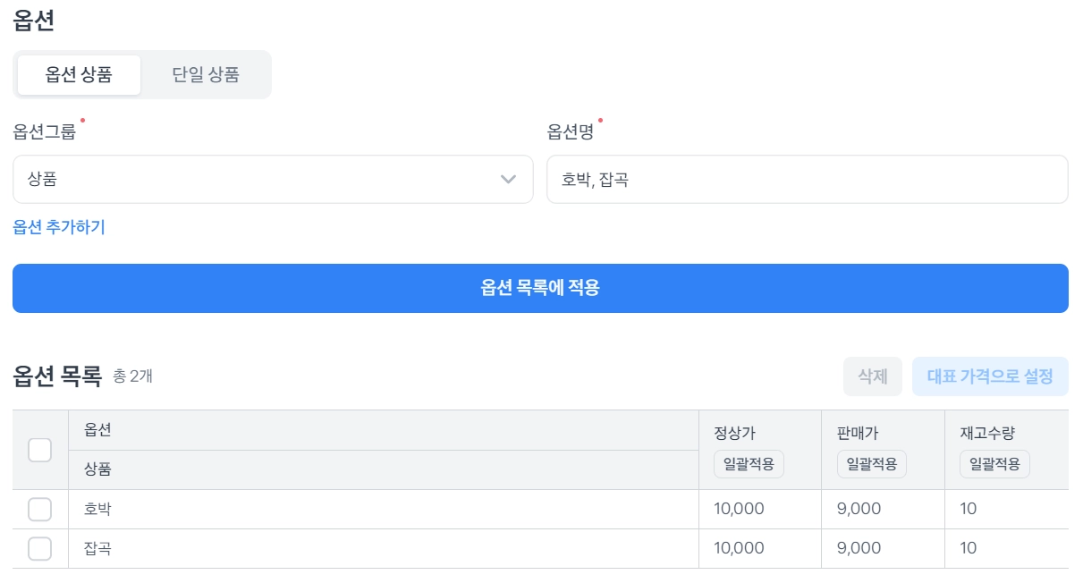 옵션그룹과 옵션명 기재가 완료되었다면, “옵션 목록에 적용” 버튼을 눌러서 옵션 목록을 생성해주세요.