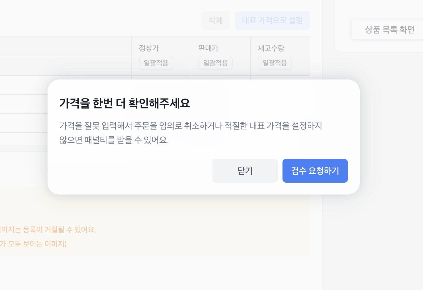 검수 반려 사유에 대한 수정 없이 반복적으로 검수를 요청하는 경우 상품 노출이 무기한 연기될 수 있습니다.
