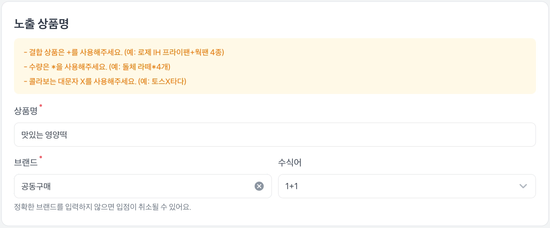 브랜드 입력 시, 정확한 브랜드를 입력하지 않거나 의도적으로 타사 브랜드로 오인될 수 있는 브랜드명 입력 시 페널티가 부과될 수 있어요.