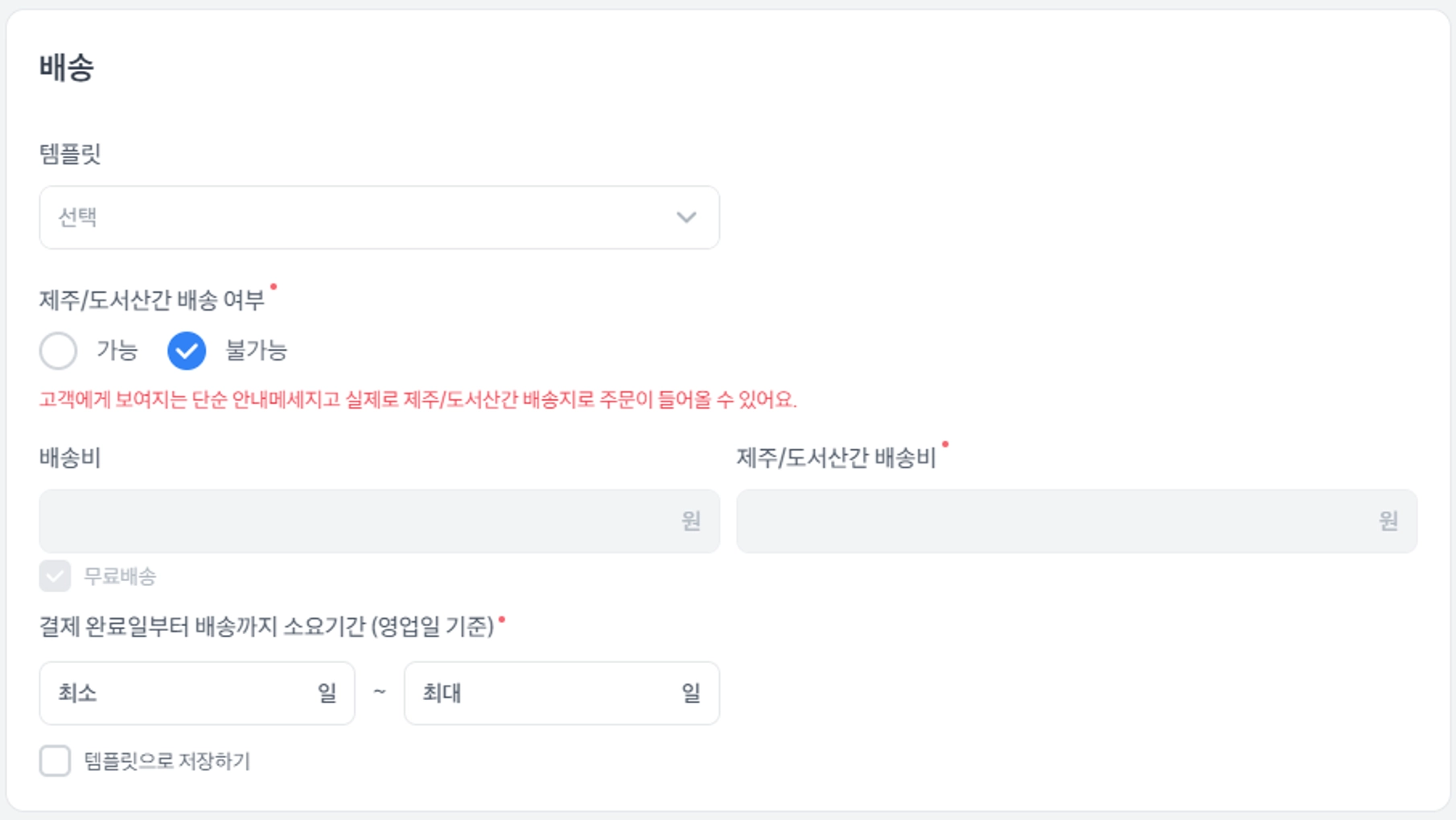 제주/도서산간 배송비와 배송 소요기간은 숫자만 입력 가능해요.
