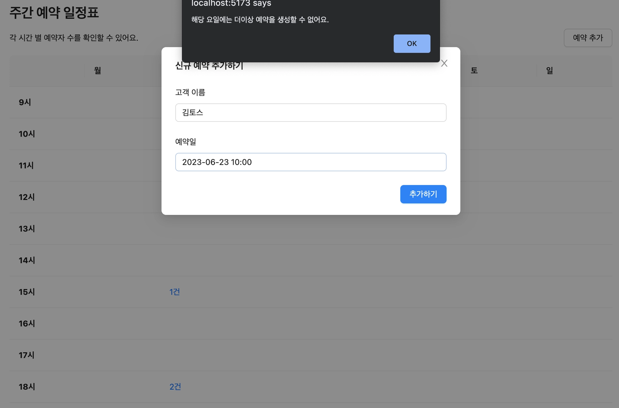 “신규 예약 추가하기” 모달에서 선택한 날짜의 예약 건수가 이미 최대에 도달했다면 오류 메시지를 출력해주세요.
