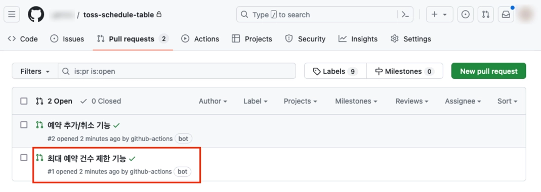 과제 안내 단계에서 자동으로 생성된 PR 중, “최대 예약 건수 제한 기능” PR을 확인해주세요.