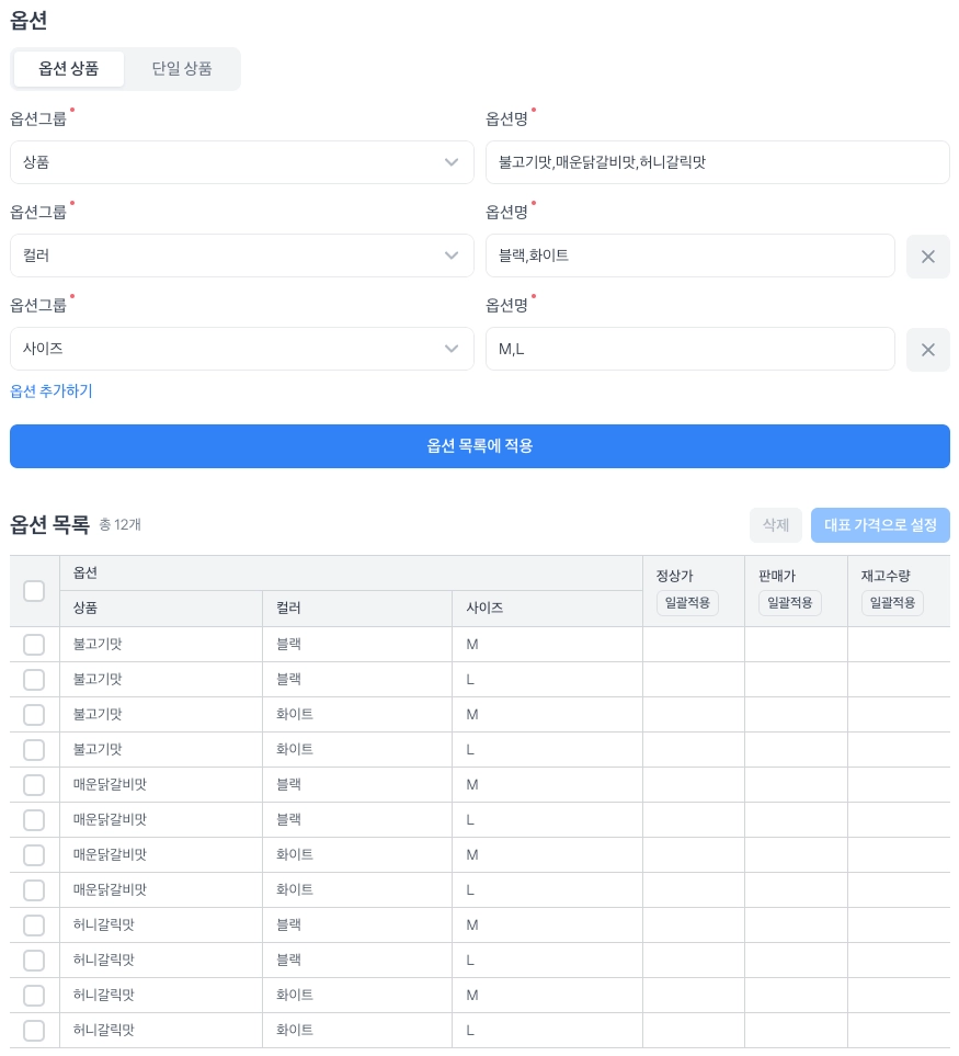 재고(토스 셀러 어드민 예시): 옵션 목록