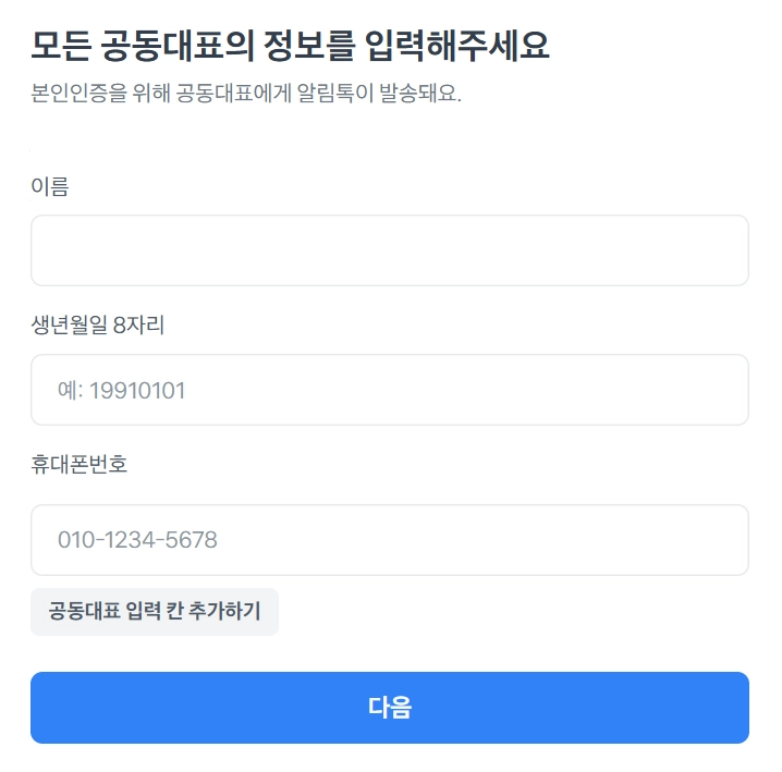 ๊ณต๋™๋Œ€ํ‘œ์ž๊ฐ€ ์žˆ๋‹ค๋ฉด, ์ถ”๊ฐ€ํ•˜๊ธฐ ๋ฒ„ํŠผ์„ ๋ˆŒ๋Ÿฌ ์ถ”๊ฐ€ ํ›„ ๋Œ€ํ‘œ์ž, ๊ณต๋™๋Œ€ํ‘œ์ž ๋ชจ๋‘ ์ธ์ฆ์ด ํ•„์š”ํ•ด์š”.