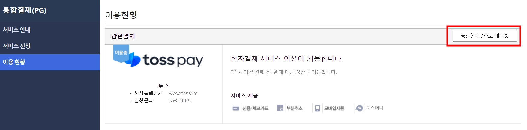 ๊ฒฝ๋กœ : ์„œ๋น„์Šค ์‹ ์ฒญ โ†’ ์ผ๋ฐ˜ PG โ†’ ๊ฐ„ํŽธ๊ฒฐ์ œ โ†’ ํ† ์Šค ์„ ํƒ