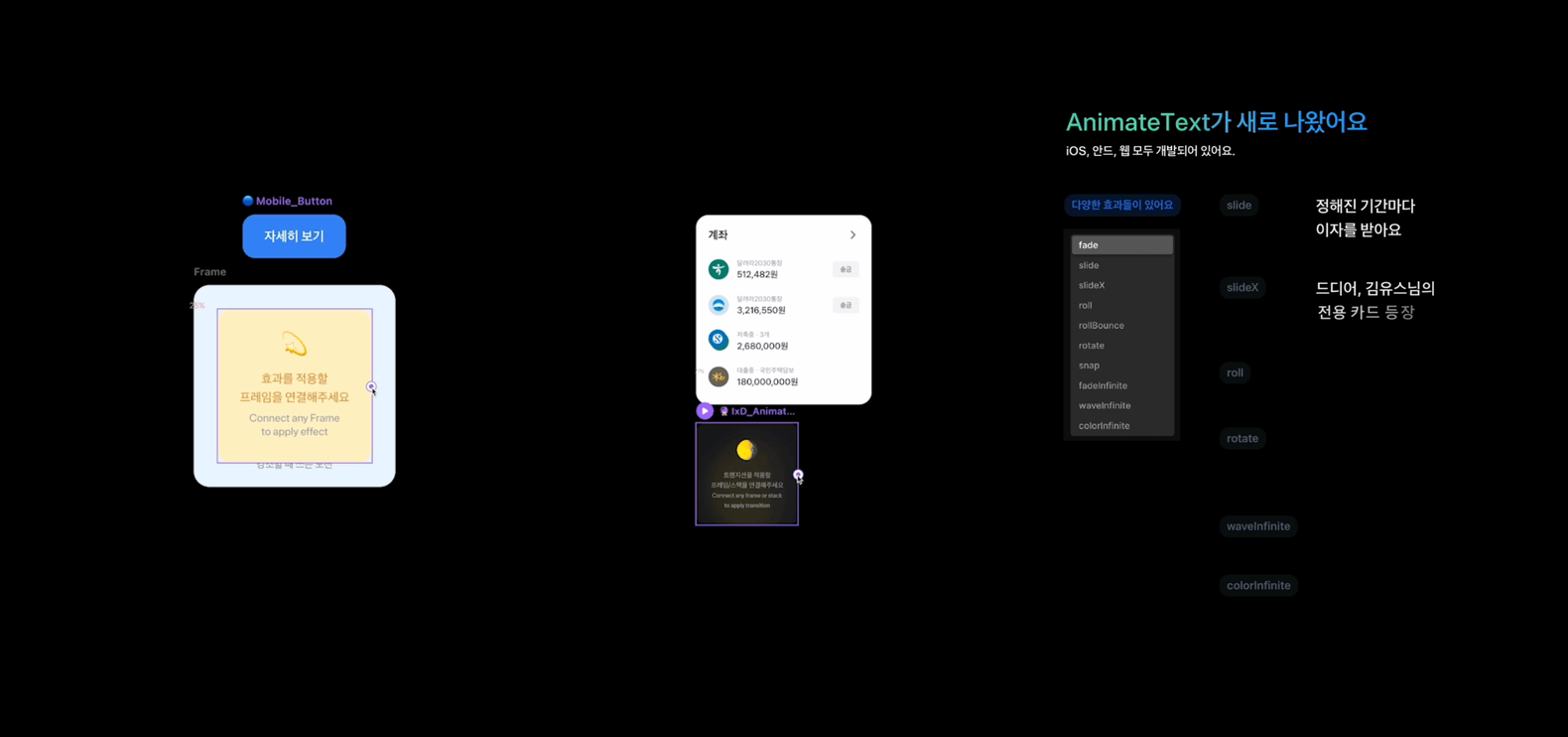 무언가를 강조할 때, 리스트가 화면 안에 등장하고 사라질 때, 글자에 모션을 넣을 때 등 각 상황에 맞는 다양한 모션을 컴포넌트화 해서 프로덕트 디자이너분들이 Framer에서 쉽게 사용할 수 있게 했어요.