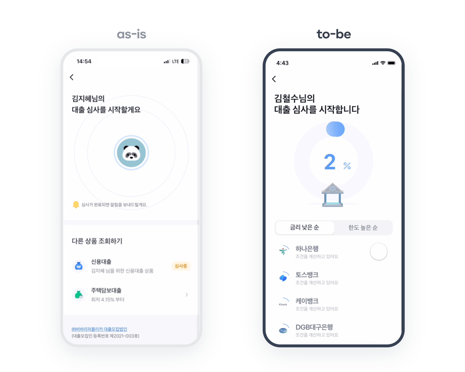 대출 심사화면은 30초 이상의 심사 시간이 소요되는 퍼널이에요. 기존에는 정적인 화면을 보여줬다면, 실시간으로 정보를 보여주어 진행상황을 보여주는 방식으로 개선하여 이탈률을 개선했어요.