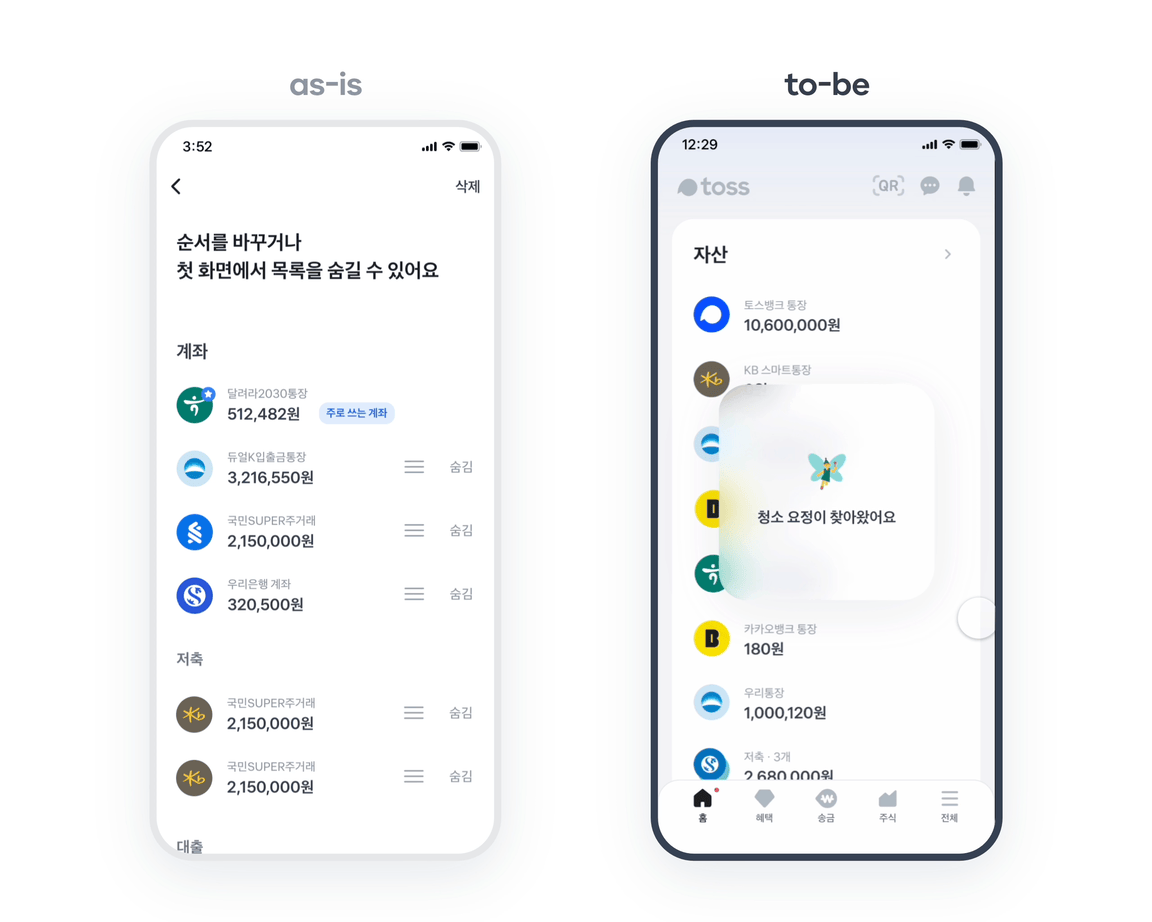 많은 사용자들이 홈 화면에 사용하지 않는 계좌를 남겨두고 있어서 하단에 있는 중요한 기능이 노출되지 않는다는 문제의식이 있었어요. 많은 사용자에게 행동을 유도해야했고 앱을 열자마자 무조건 이 기능을 노출해야했죠. 강제적이지 않으면서도 정보를 자연스럽게 전달하기위해 연결성 있게 퍼널을 만들었어요. 결과적으로 30%의 유저가 계좌를 숨기고, 하단 영역을 확인하는 유저의 비중이 약 5~7%p 정도 증가했어요.