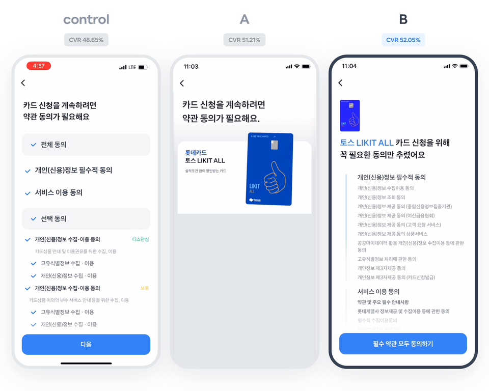 카드를 우편으로 전달받을때의 경험을 살린 A안과, 필수/선택약관의 화면을 분리한 후 CTA만 눌러서 넘어갈 수 있게 한 B안을 만들어 실험했어요.