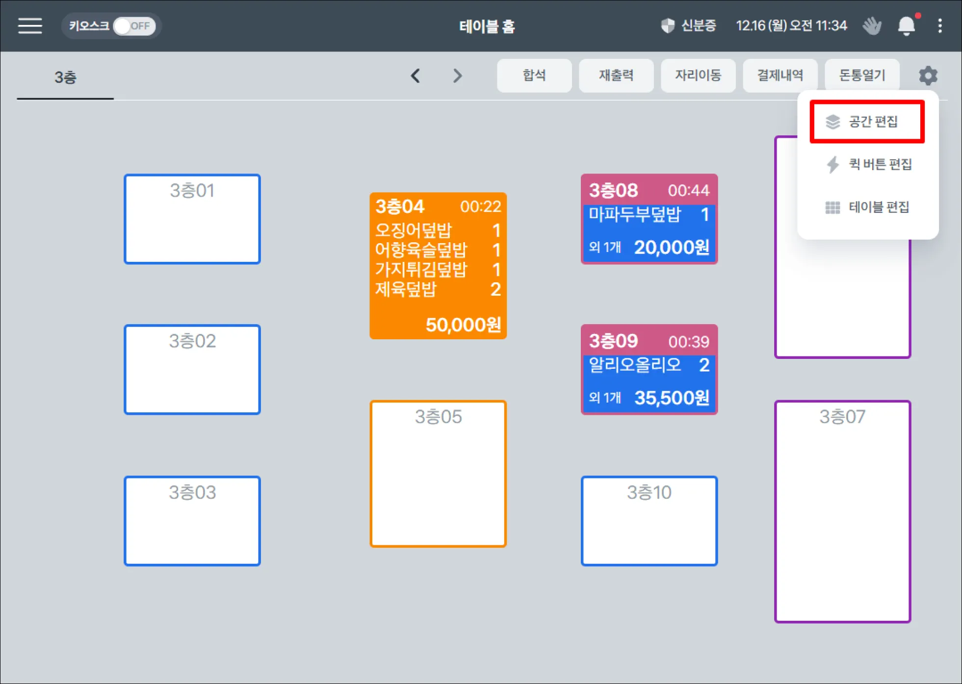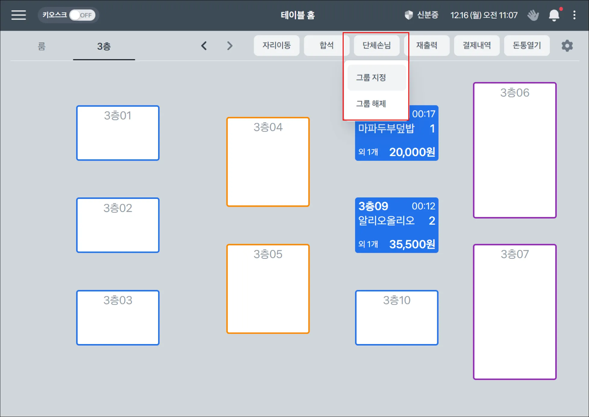 상단의 [자리이동]을 누르면 이미 주문이 완료된 테이블의 위치를 변경할 수 있어요.