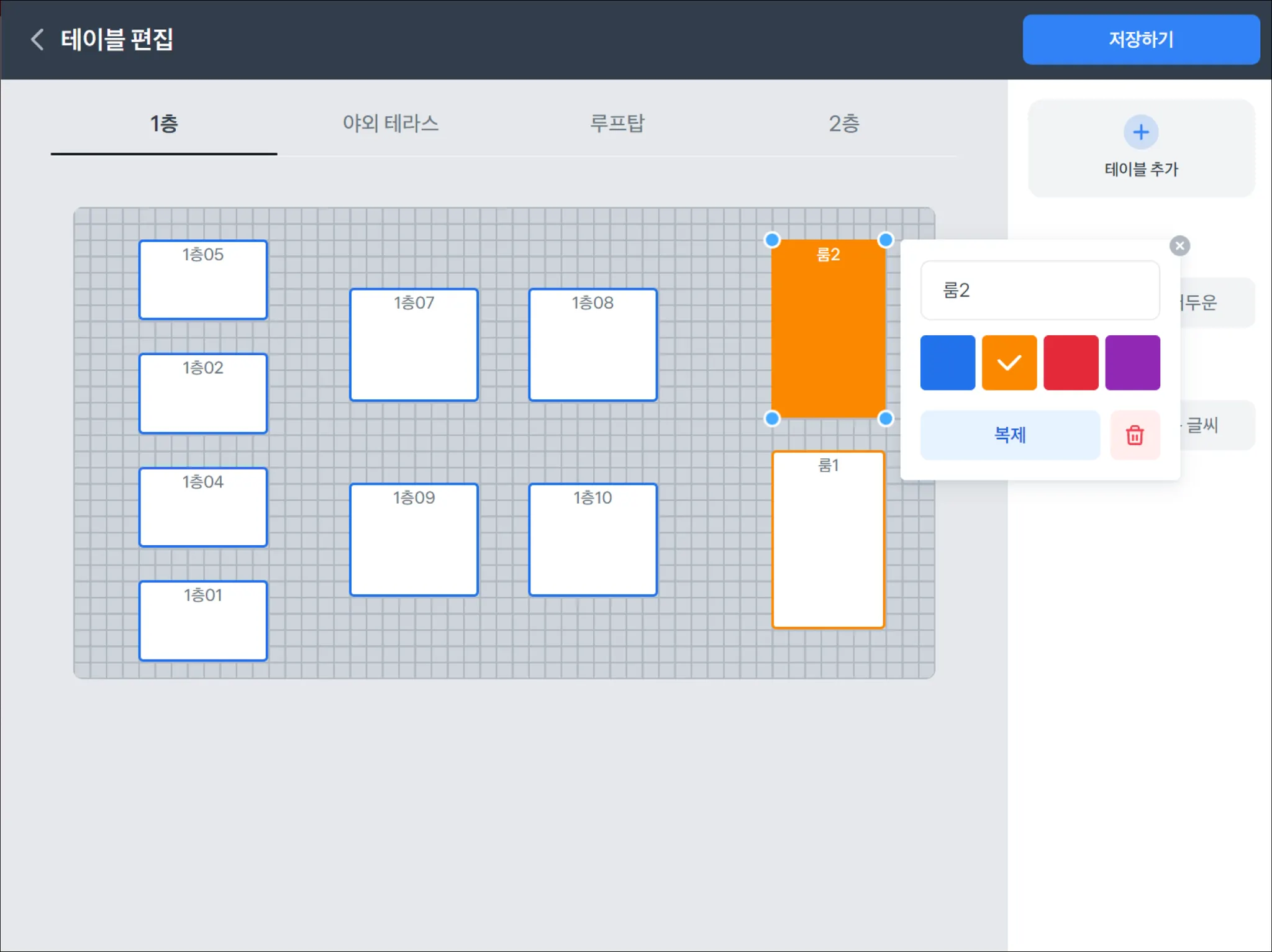 테이블 추가 : 실제 배치대로 테이블을 추가해주세요.