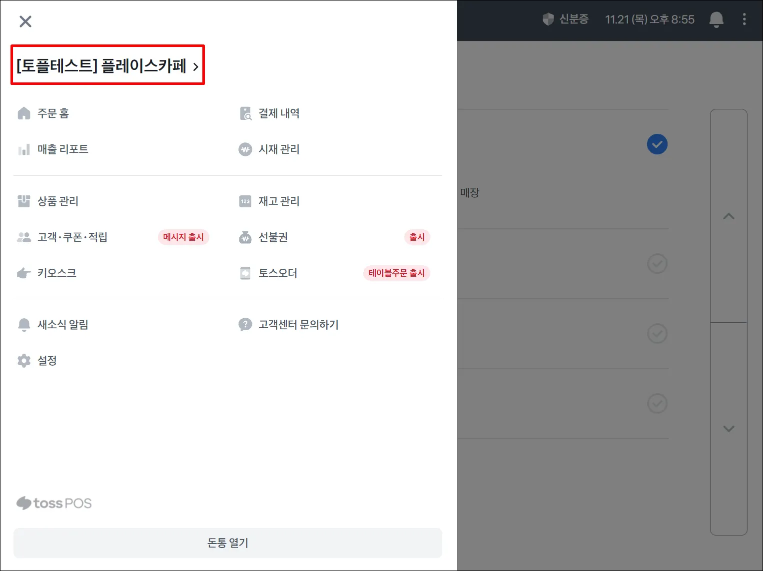 포스 왼쪽 상단의 ≡ 버튼 클릭 후 상단에 보이는 매장명을 클릭해주세요.