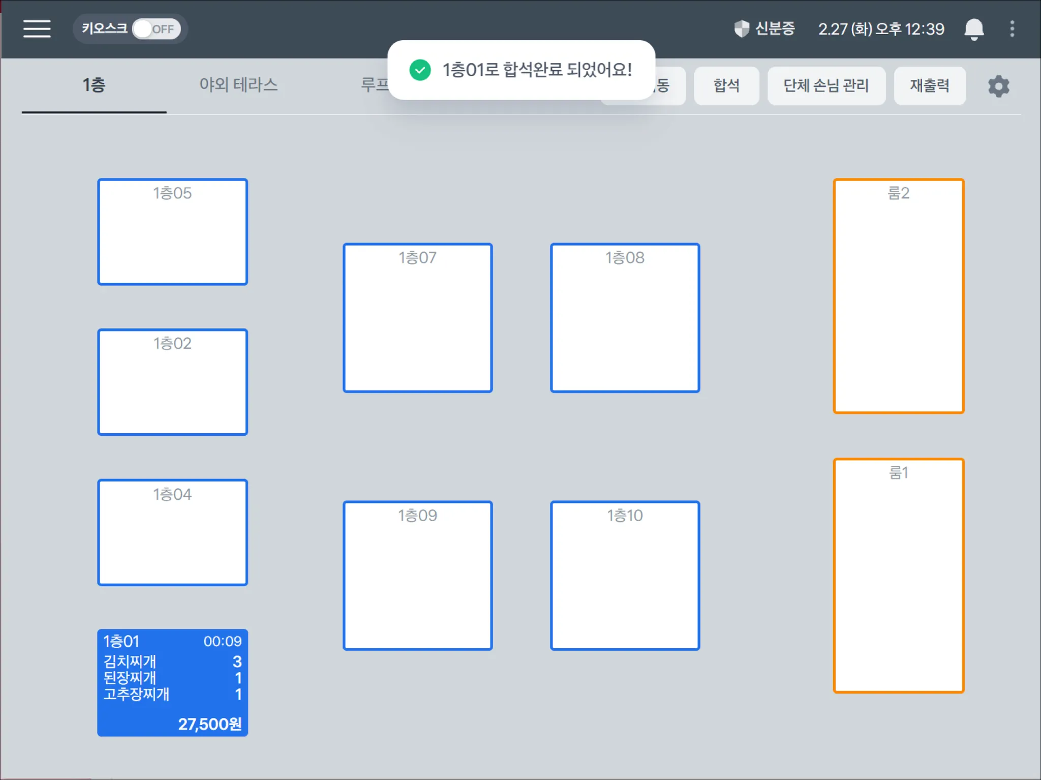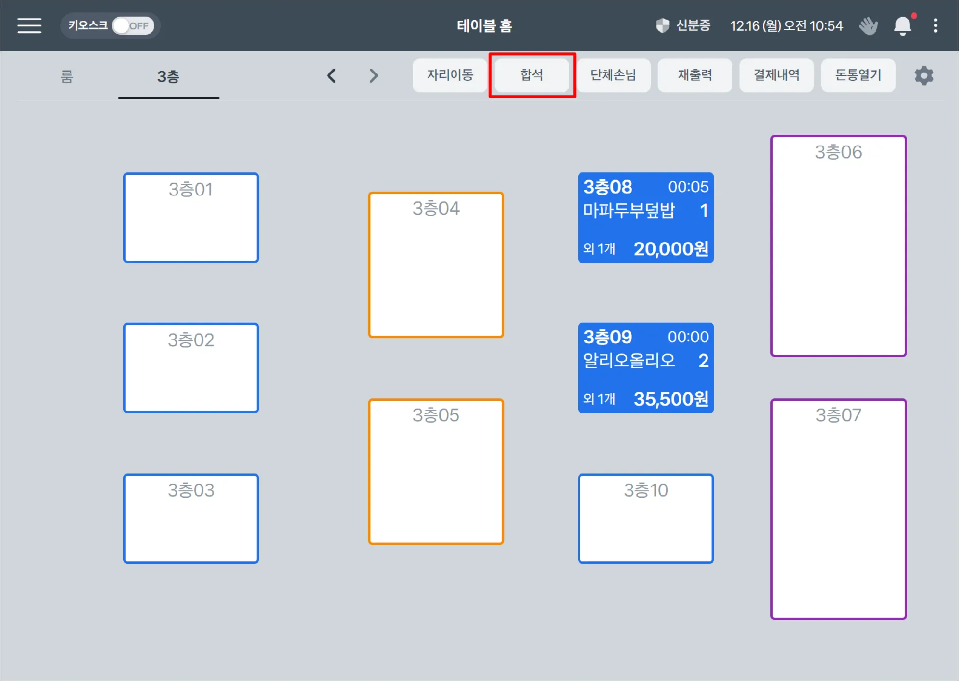 상단의 [합석]을 누르면 두 테이블을 합석할 수 있어요
