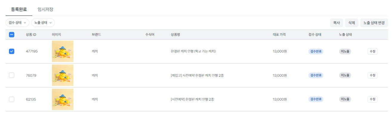 체크박스로 노출 상태값을 변경할 상품 선택 후, 우측 상단의 “노출 상태 변경” 버튼을 클릭해주세요