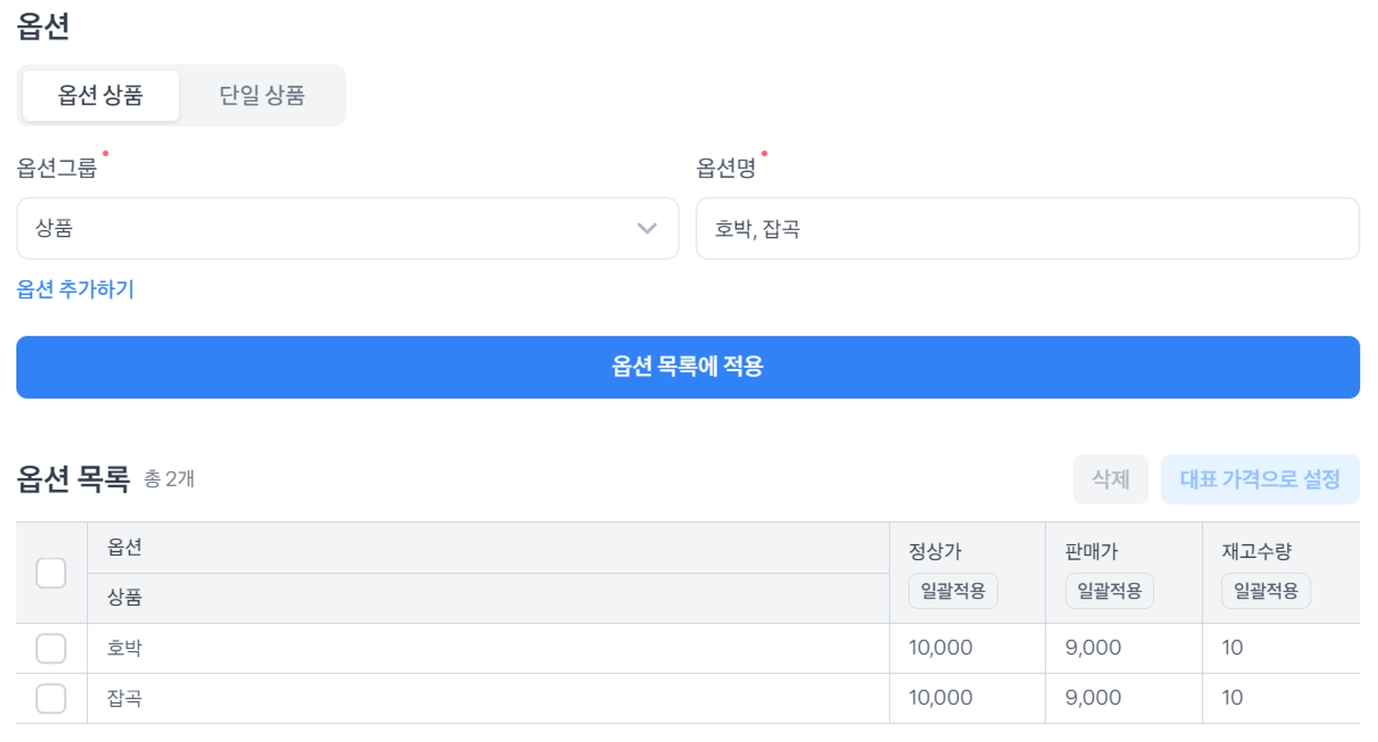 옵션그룹에는 상품 판매 옵션의 카테고리를, 옵션명에는 세부 옵션을 입력해주세요