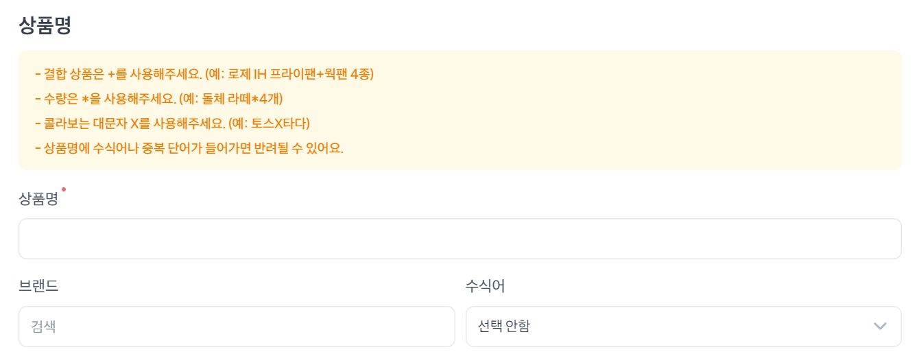 브랜드 입력 시, 정확한 브랜드를 입력하지 않거나 의도적으로 타사 브랜드로 오인될 수 있는 브랜드명을 입력하면 페널티가 부과될 수 있어요.