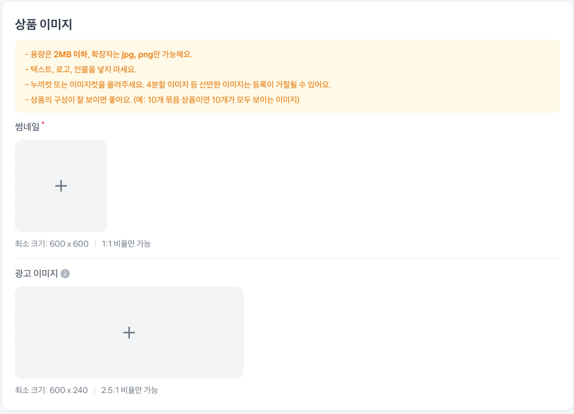 썸네일은 1:1, 광고이미지는 2.5:1 비율 이미지만 업로드 가능해요