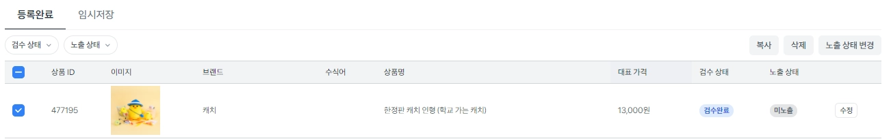 상품 판매가 일시적으로 불가한 경우, 상품 목록에서 노출 상태 변경을 통해 상품이 노출되지 않도록 변경할 수 있어요