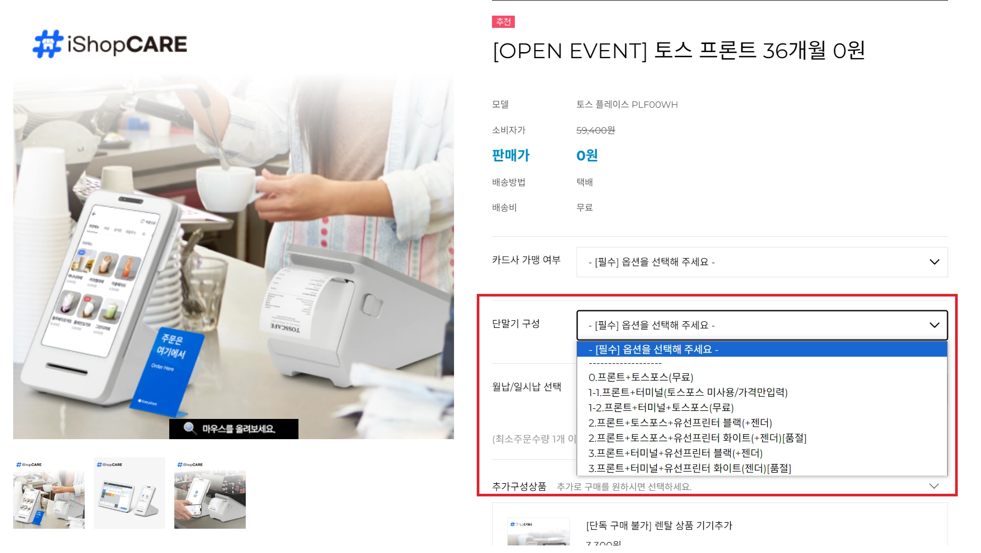 프론트 + 터미널 구매 시 월납(한 번에 납부) / 일시납 (36개월 동안 월납하실 금액 한 번에 납부)