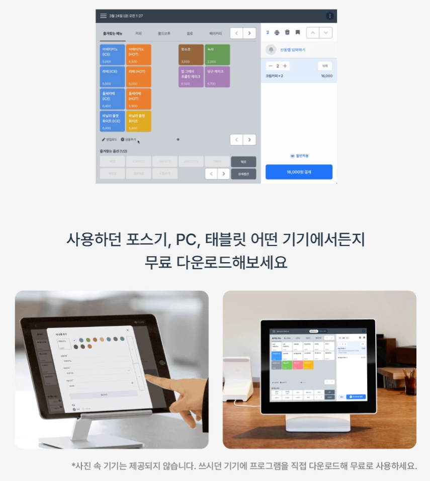 기존에 사용하시던 태블릿 / 컴퓨터 / 노트북/ 포스기에 프로그램을 설치해서 사용할 수 있어요. (기기 미제공)