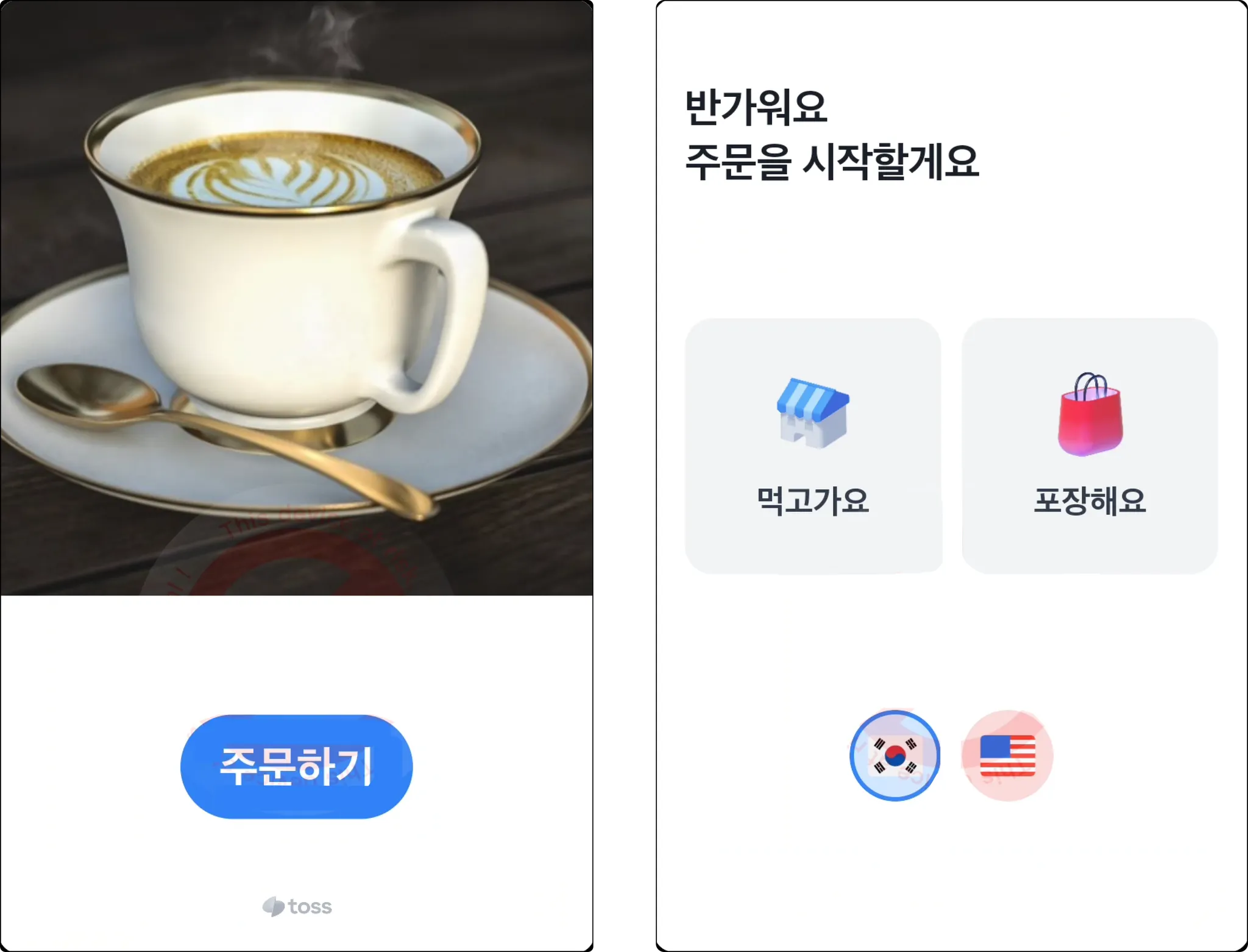 매장/포장 선택 화면에 따라 첫 화면 다음에 나오는 화면이 달라져요.