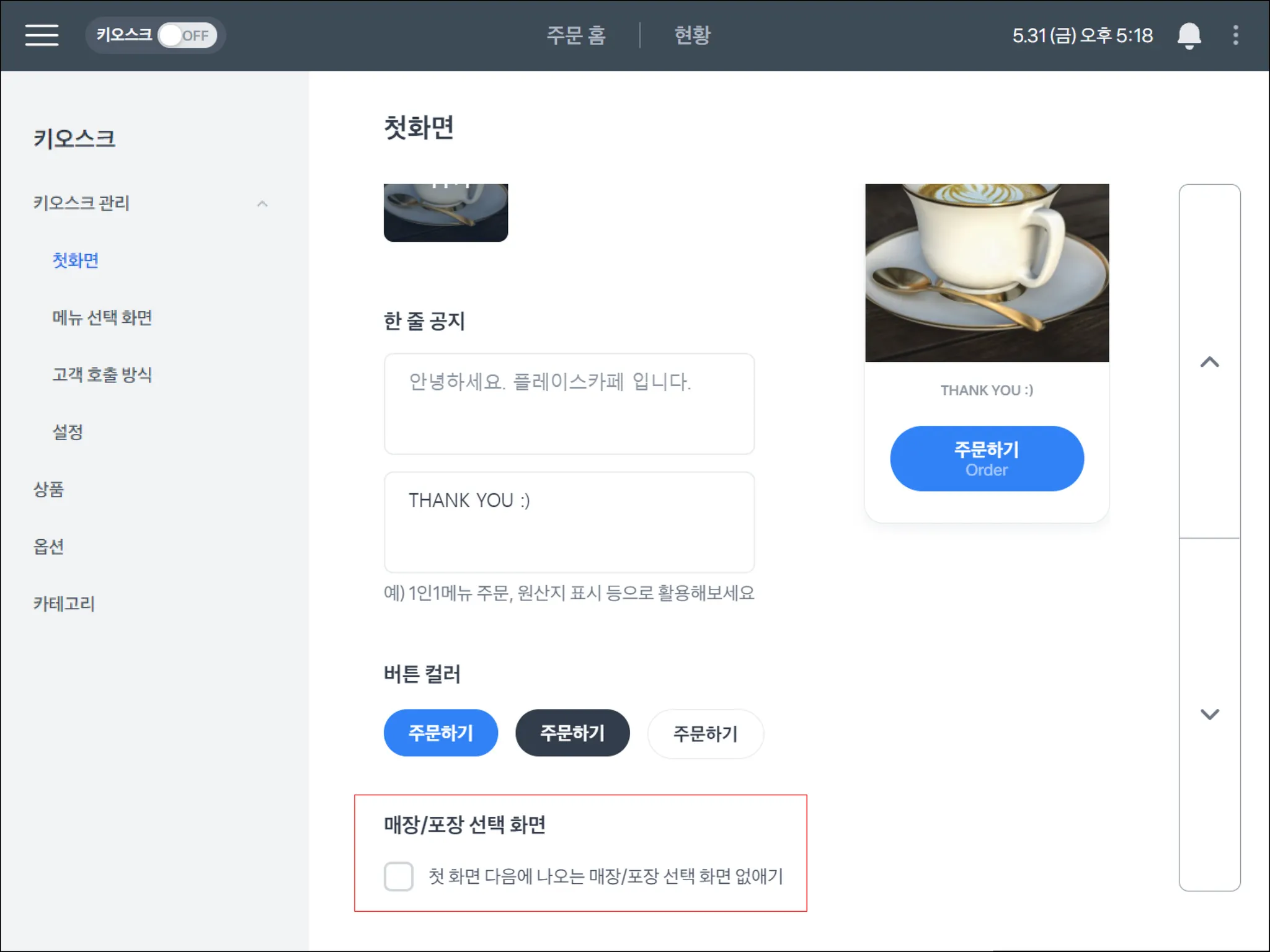 첫 화면 매장/포장 선택 화면 노출 여부 설정