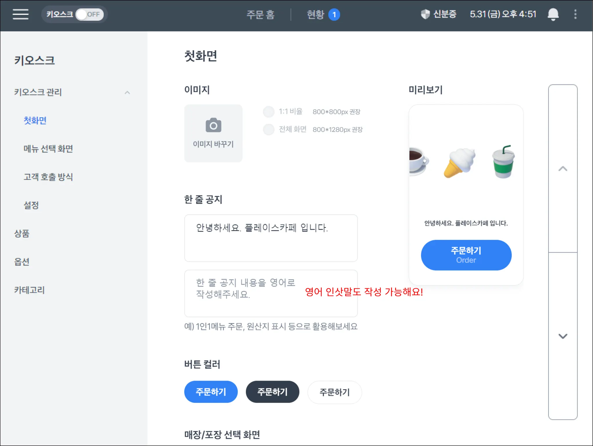 키오스크 관리 → 첫화면을 설정할 수 있어요.