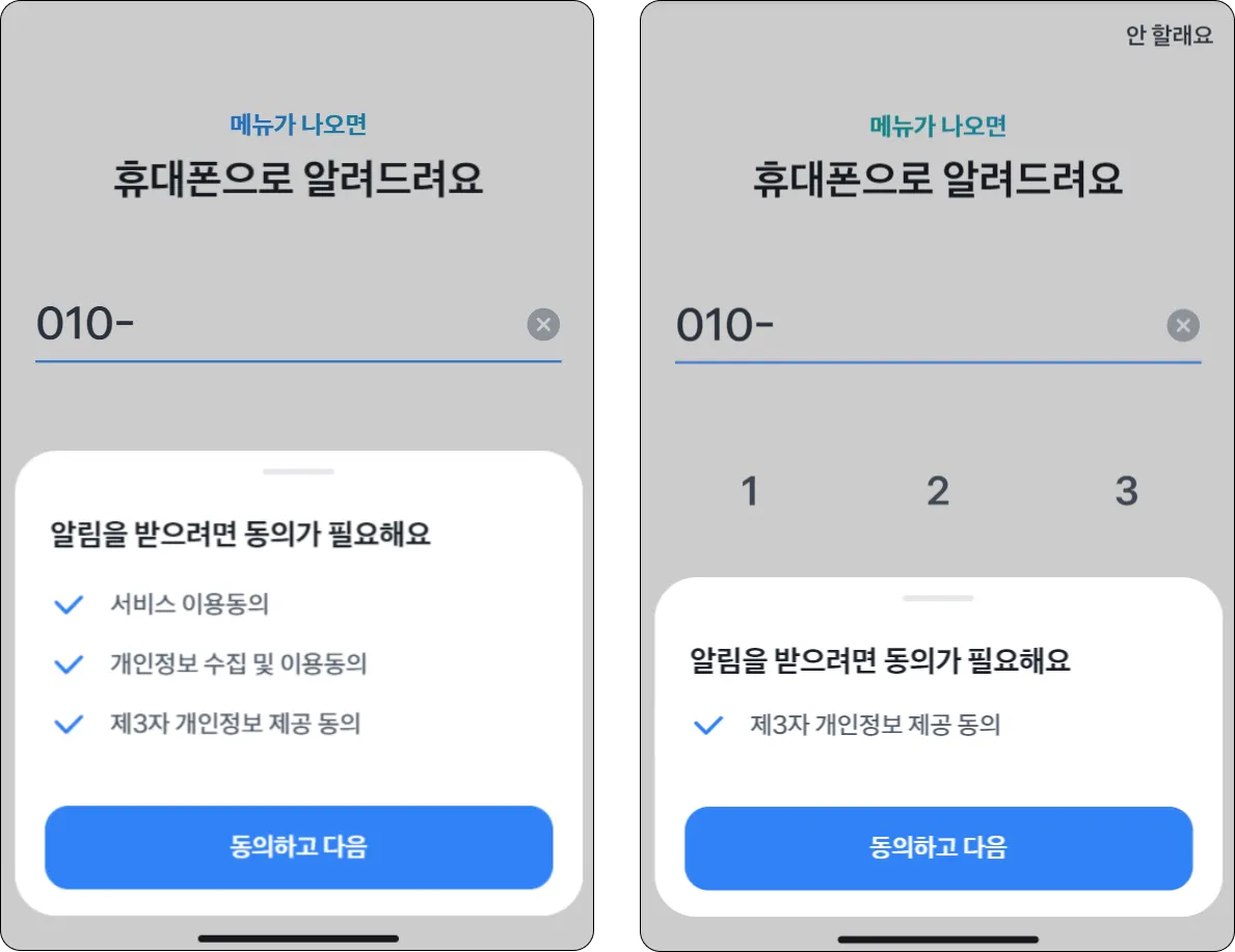 메뉴가 나오면 입력한 휴대폰 번호로 알려드려요.