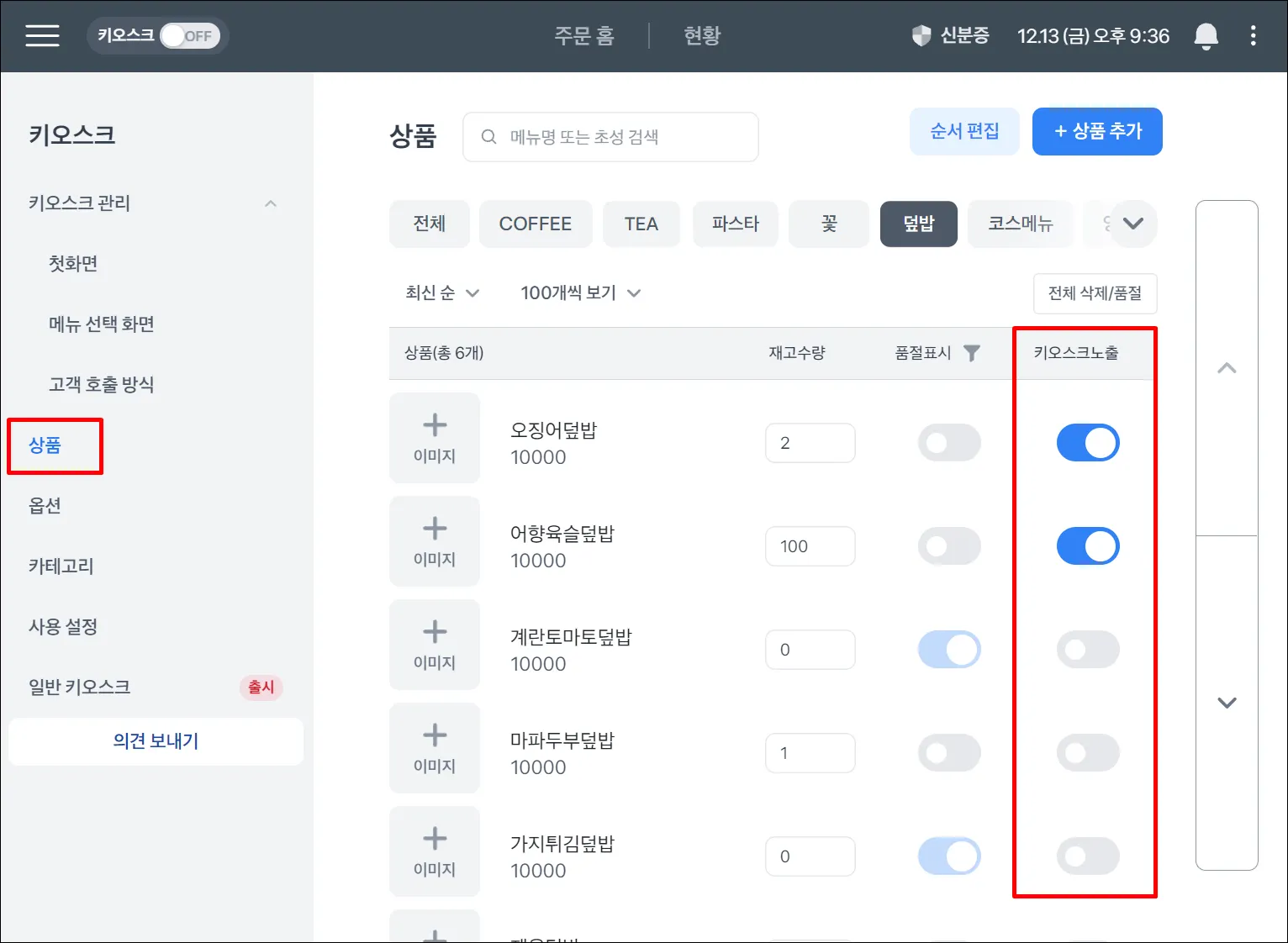 상품에서 키오스크에 노출 할 상품을 활성화 해주세요.