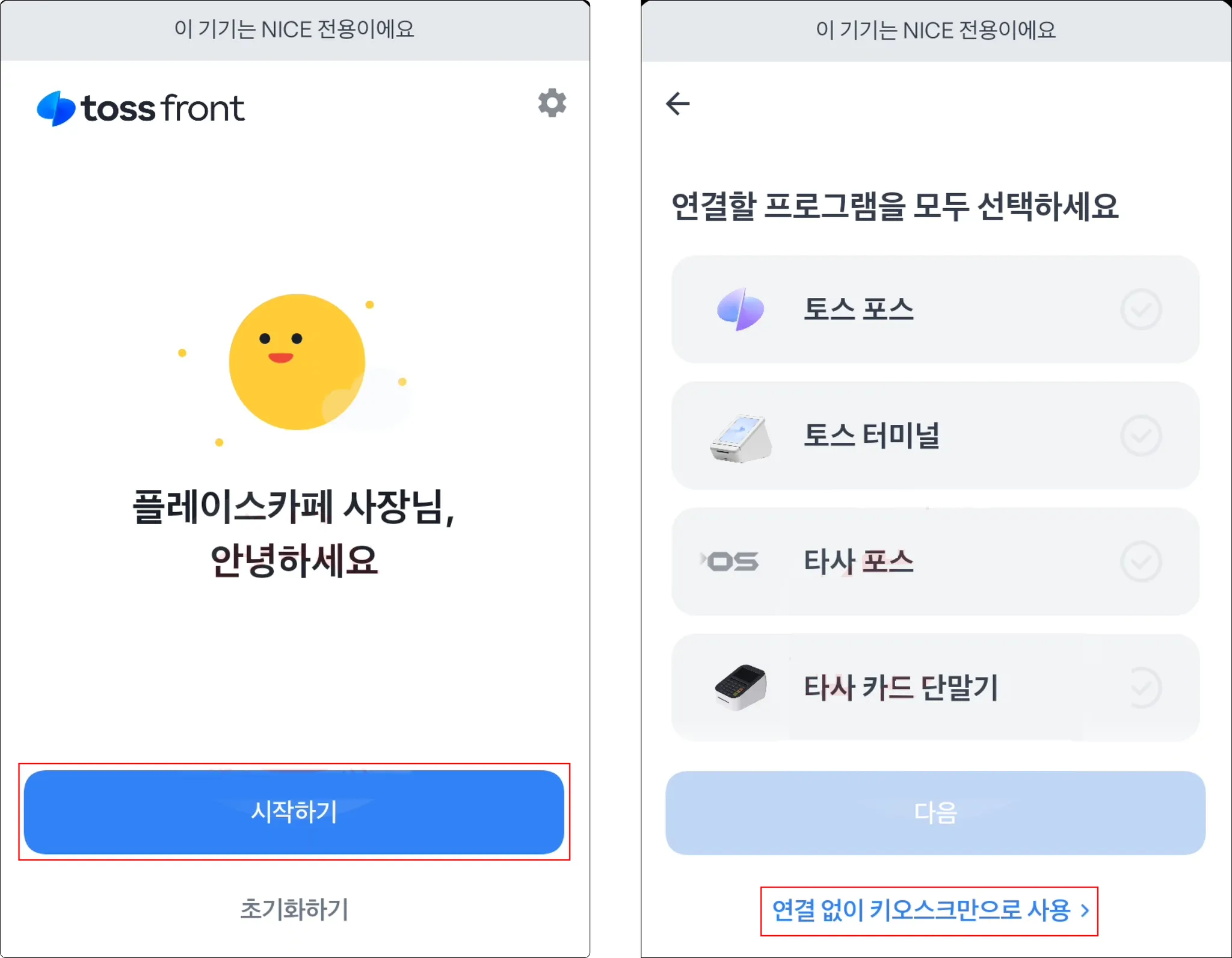 6. 프론트 기기가 재부팅되면 시작하기 → 연결 없이 키오스크만으로 사용을 눌러주세요.