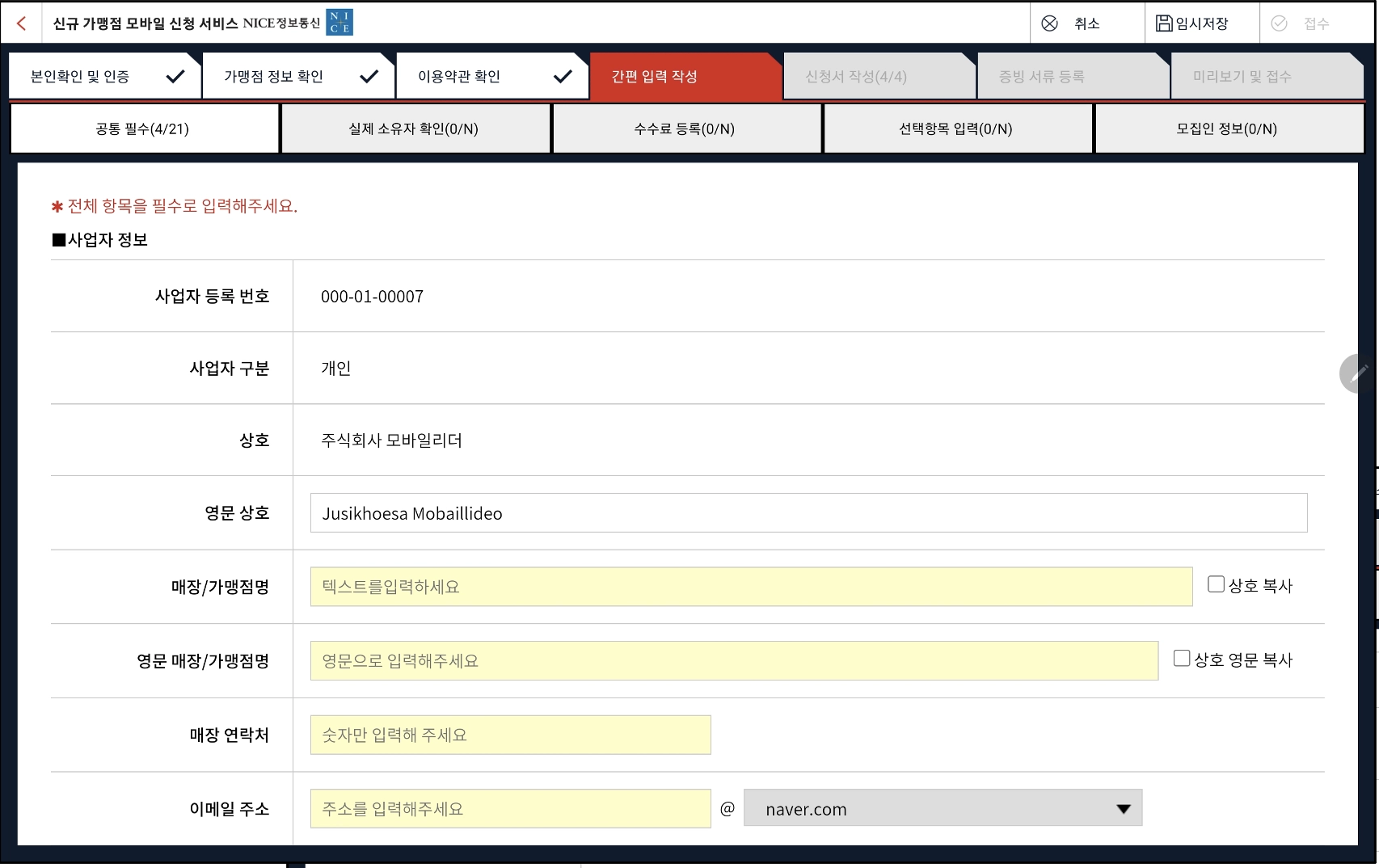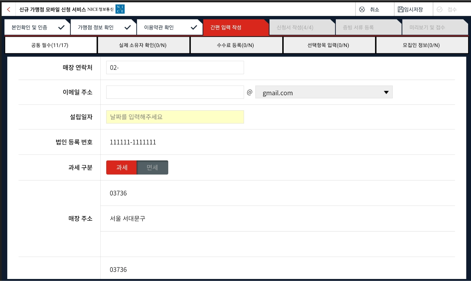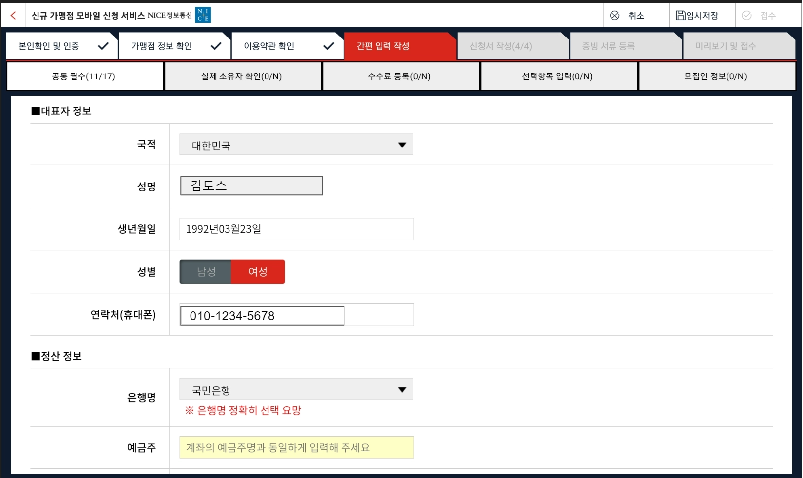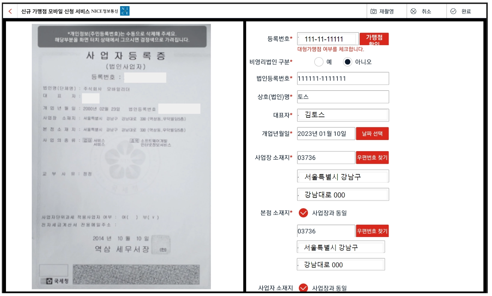가맹점주의 신분증의 내용과 다를 경우, 해당 입력란에서 직접 수정해 주세요.