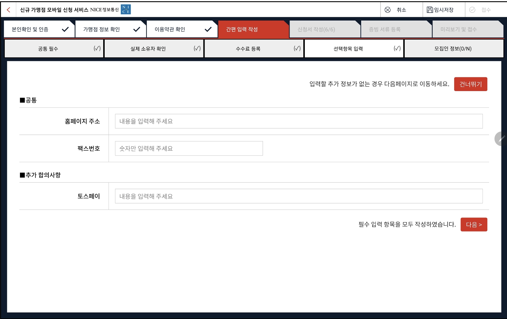 등록번호 오른쪽의 가맹점 확인 버튼을 눌러서 “대형가맹점 여부 확인이 완료되었습니다.”라는 메시지가 나오는지 확인 후 다음단계로 진행해 주세요.