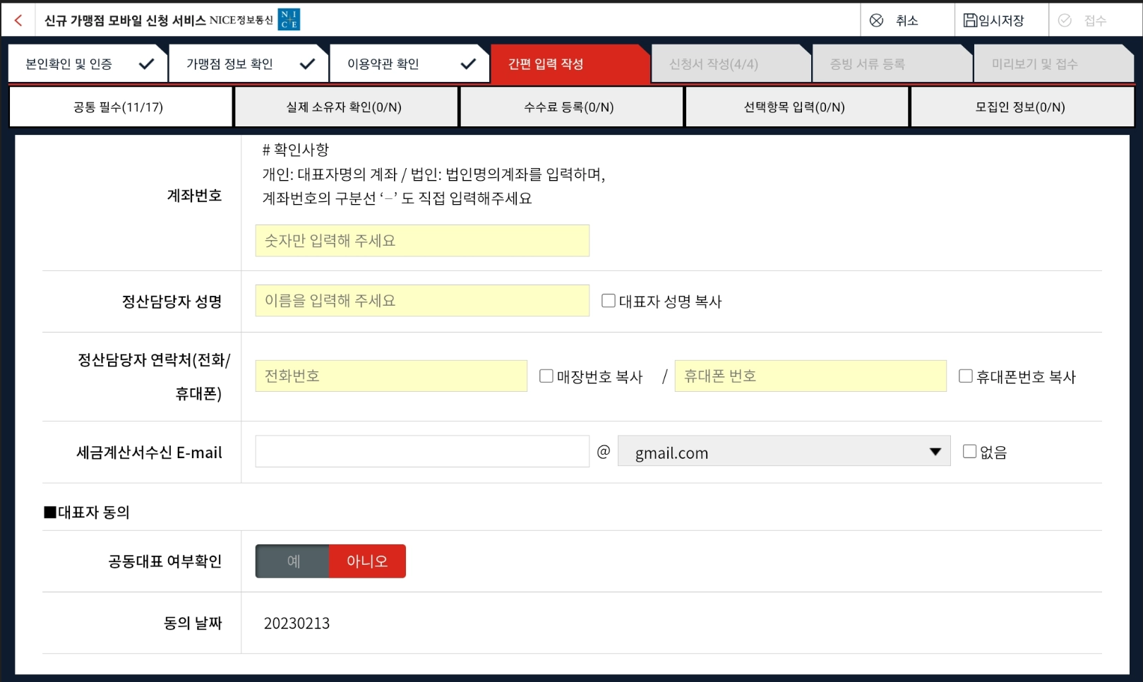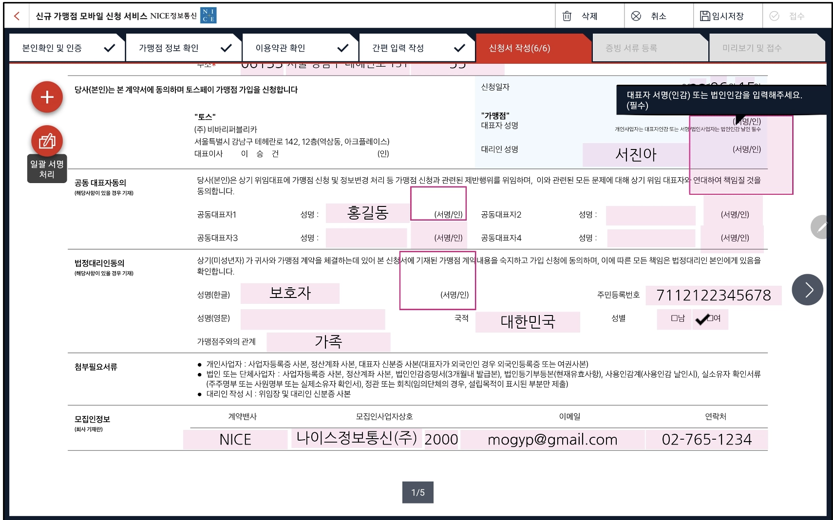 또는 신청서 상에서 서명란으로 표시되는 부분에 개별적으로 가맹점주 서명 진행도 가능해요.