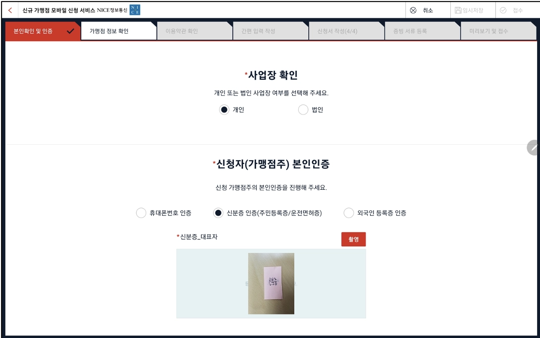 개인사업자의 경우 가맹점주의 신분증을 촬영하여 본인인증을 진행하여 주세요.