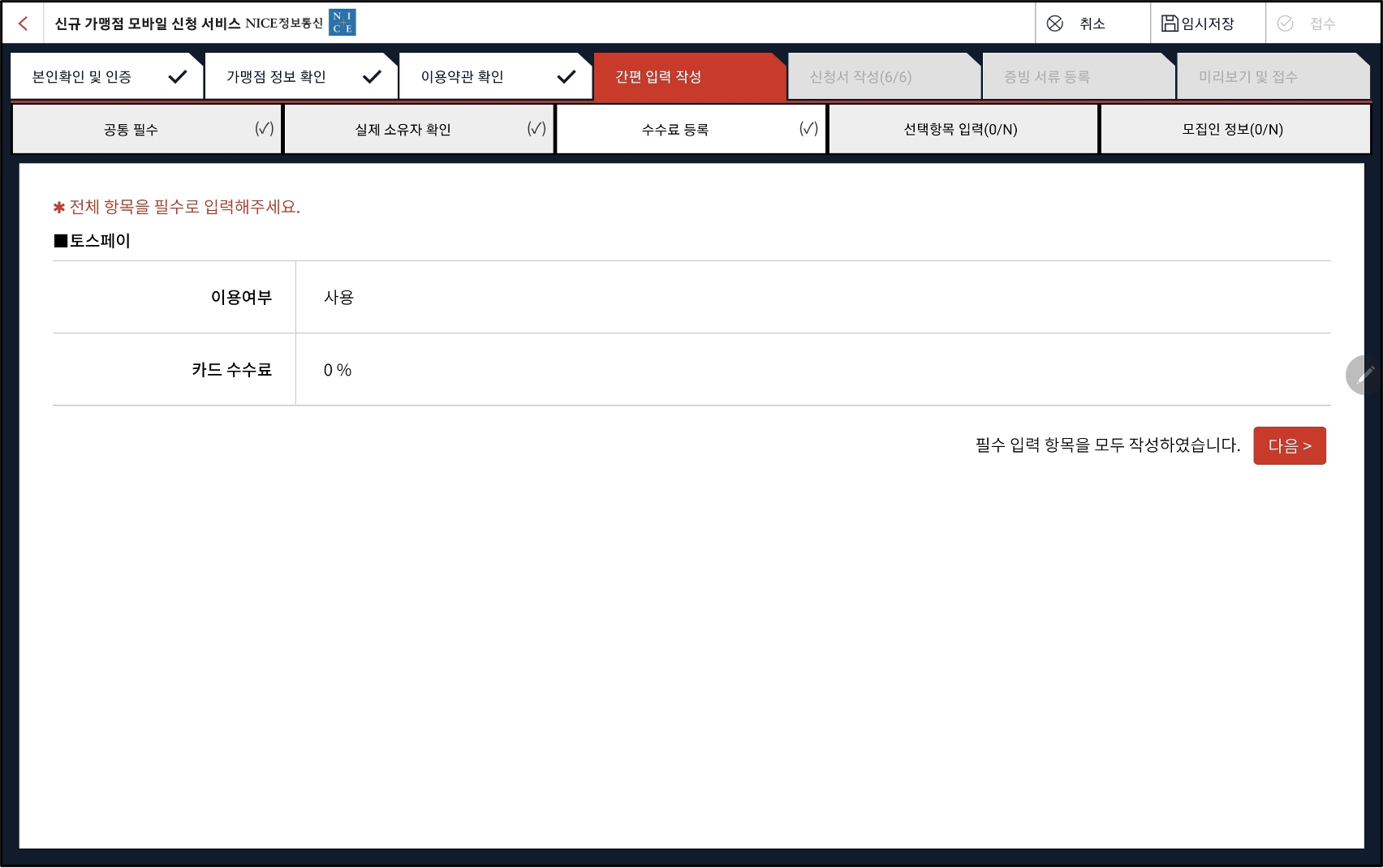 가맹점수수료는 가맹점 매출 규모에 따라 차등 수수료율을 적용하므로, 가맹점 신청시 별도로 수수료를 입력하지 않아요.