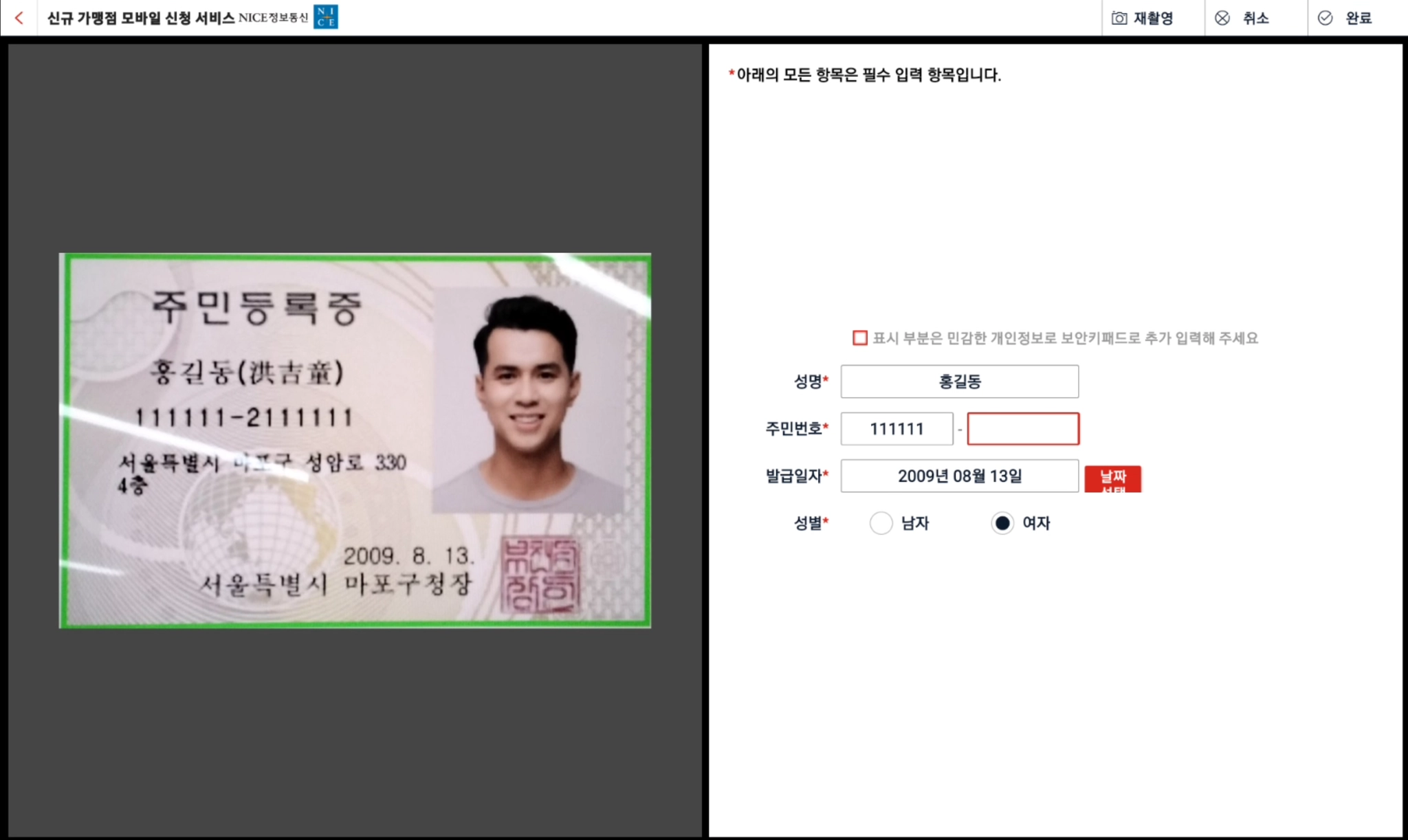 이전 단계에서 신분증 촬영 이미지로 OCR 인식한 정보로 자동 표시되어요.