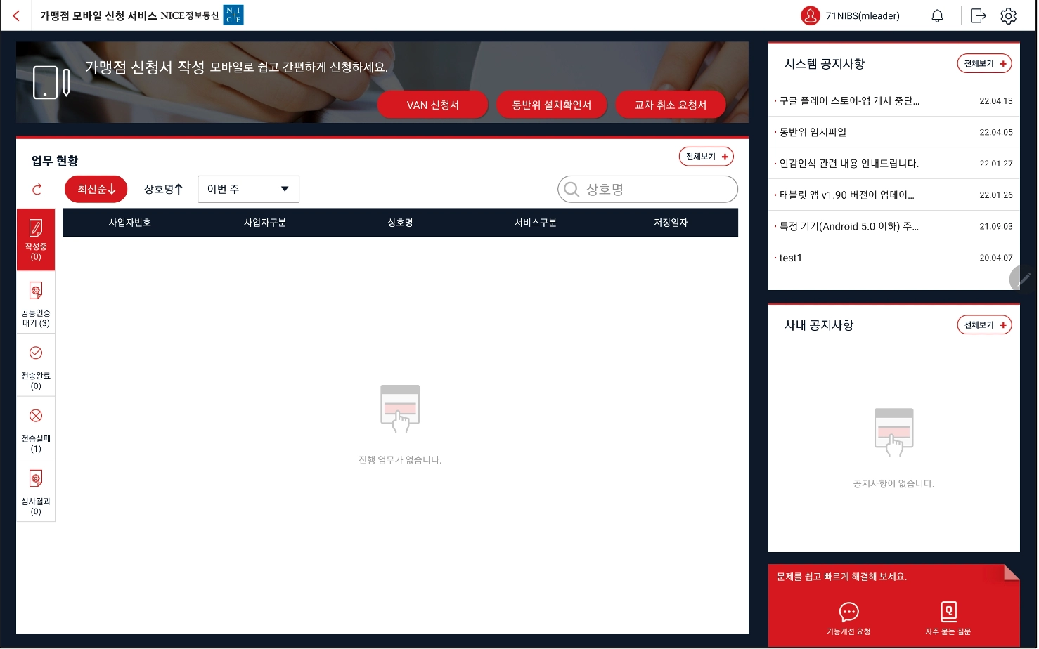 QVAN 서비스를 처음 이용하는 대리점의 경우 첫 로그인 후 대리점 인감 등록 안내 팝업화면이 나타나요. 이후 재로그인 시에는 바로 서비스 신청화면으로 이동해요.