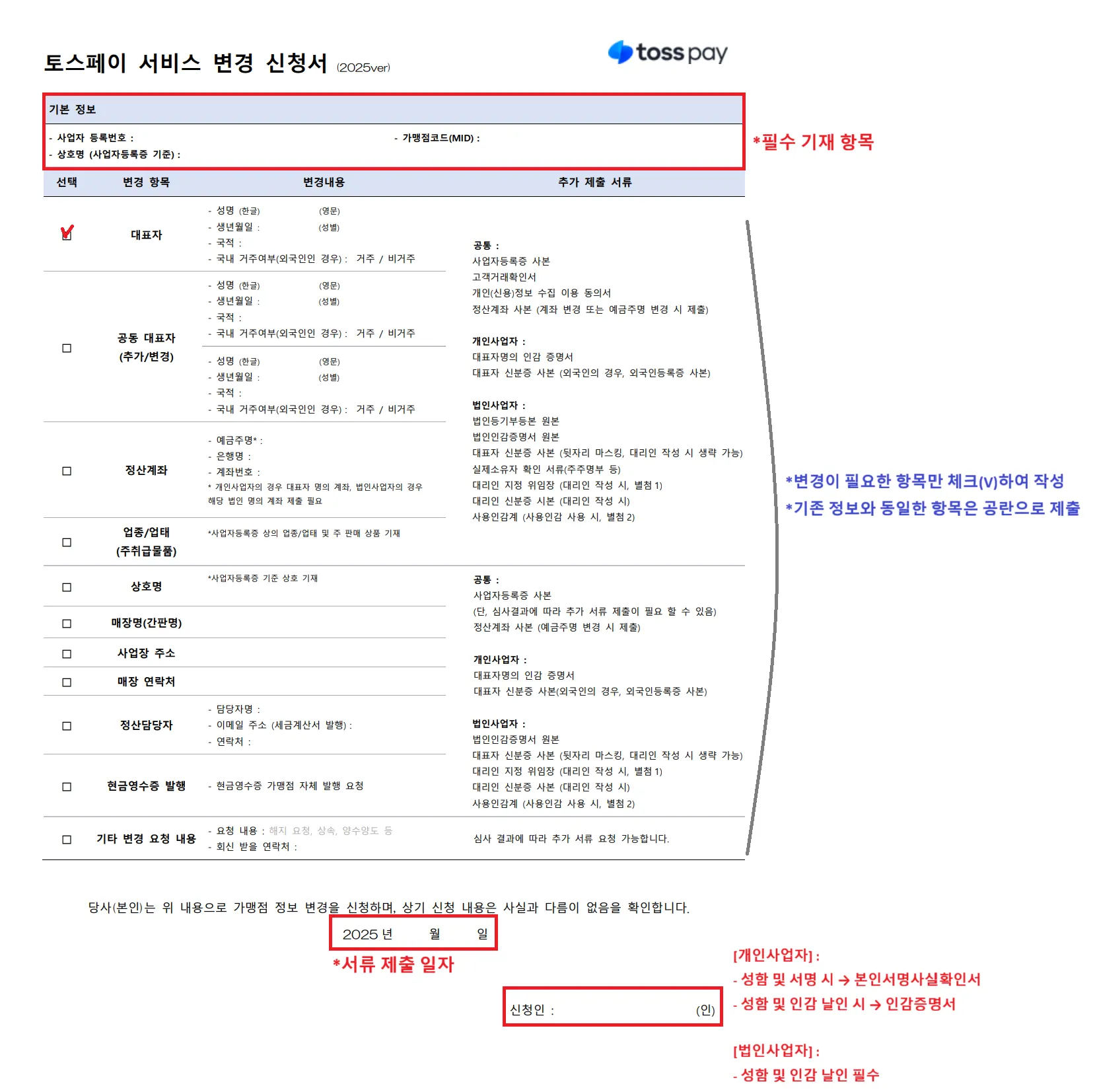 변경 신청서 내 가맹점코드(MID)는 공란으로 제출 가능해요.
