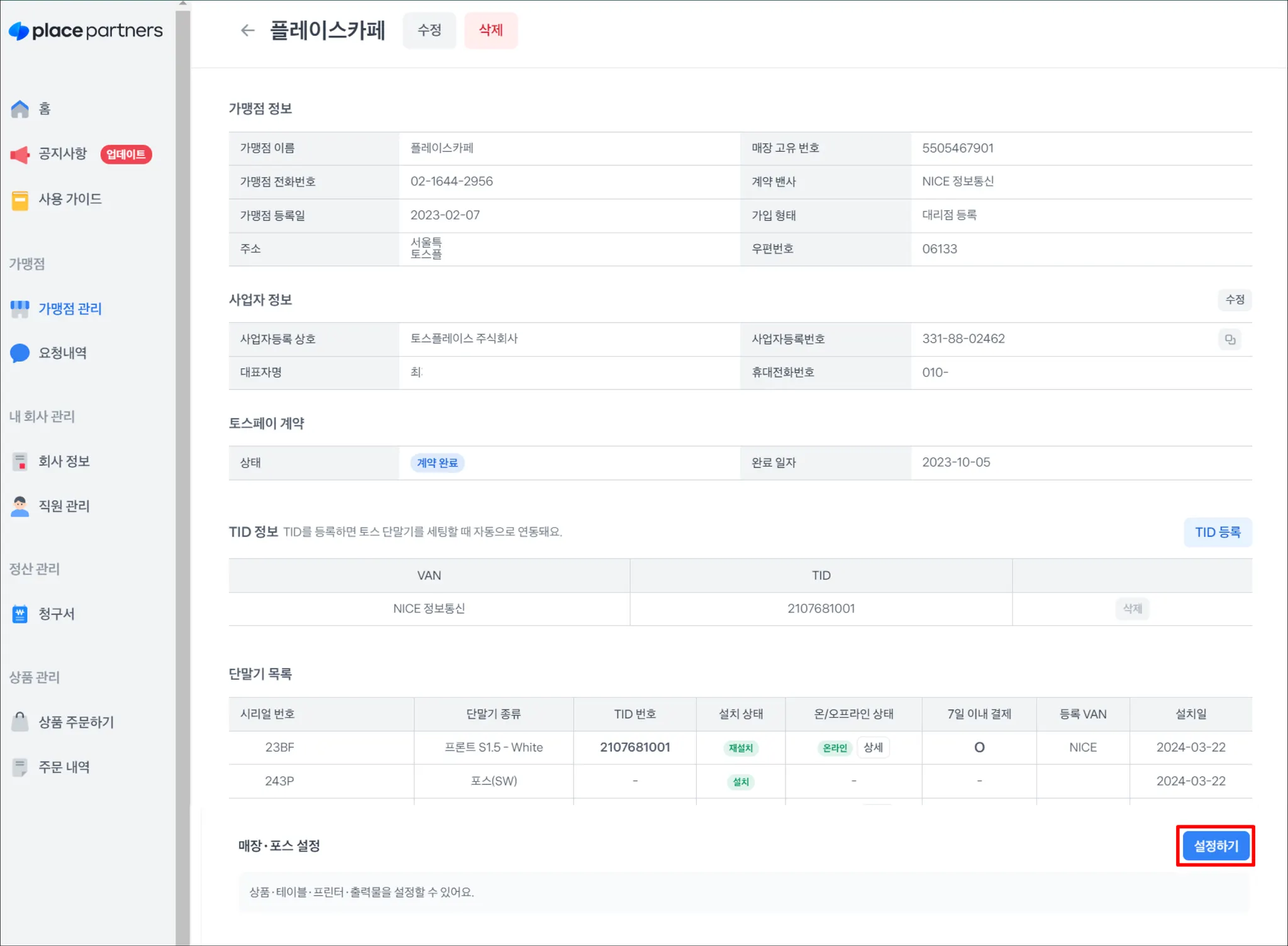 가맹점 정보 화면의 아래쪽 ‘매장 · 포스 설정’에서 설정하기를 눌러주세요.