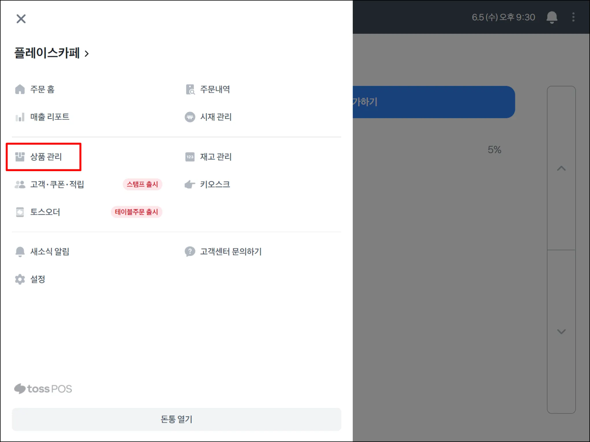 토스포스 → 왼쪽 상단 ≡ → 상품 관리를 눌러주세요.