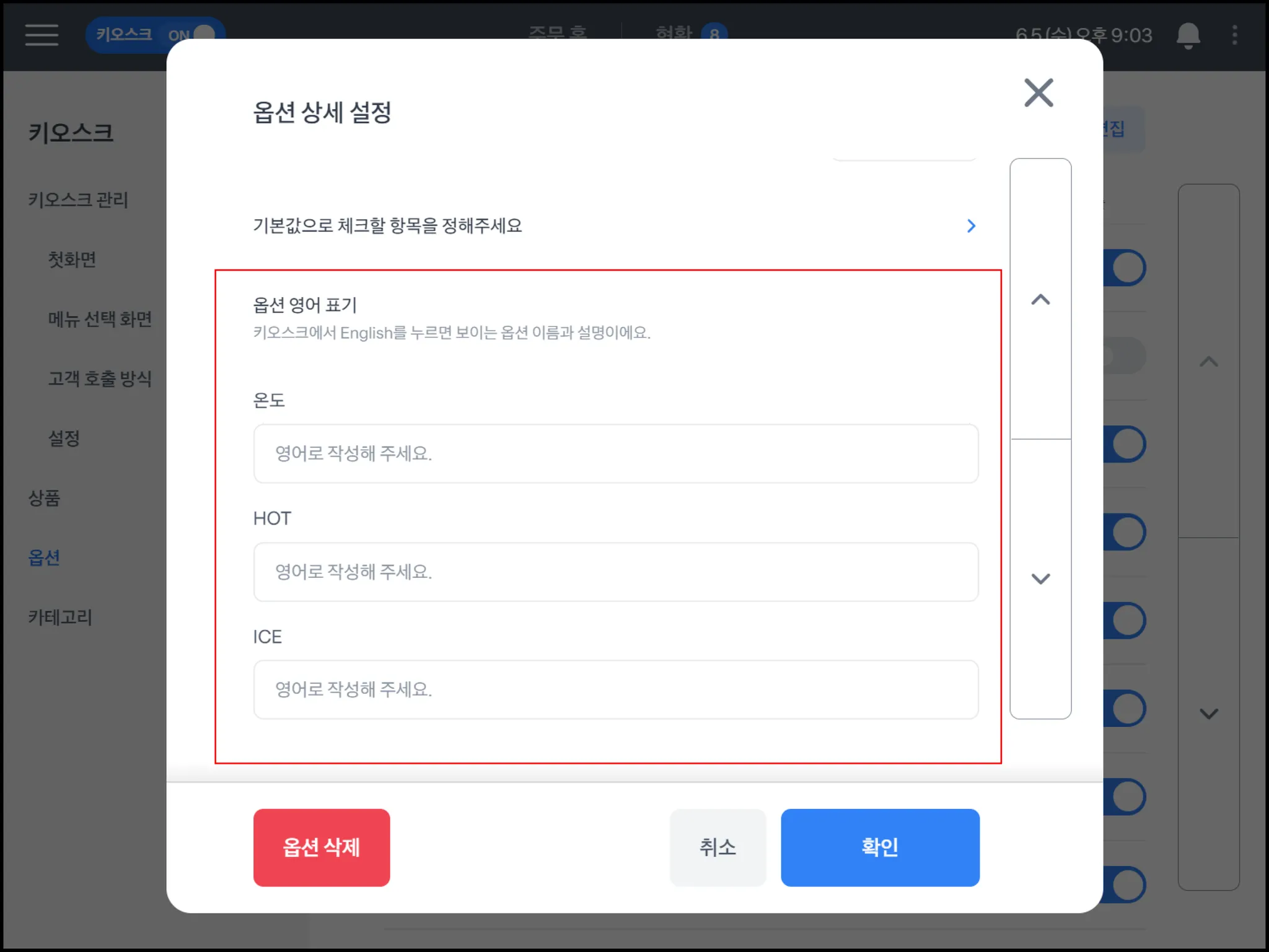 키오스크 옵션명 영문 설정