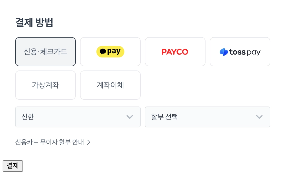 위 코드로 연동하신 경우 아래와 같은 결제창이 나타납니다. 특정 카드사를 선택하여 [결제] 버튼을 누르면 해당 카드사로 결제를 진행할 수 있습니다. 테스트키이기 때문에 실제 결제가 일어나지는 않습니다.