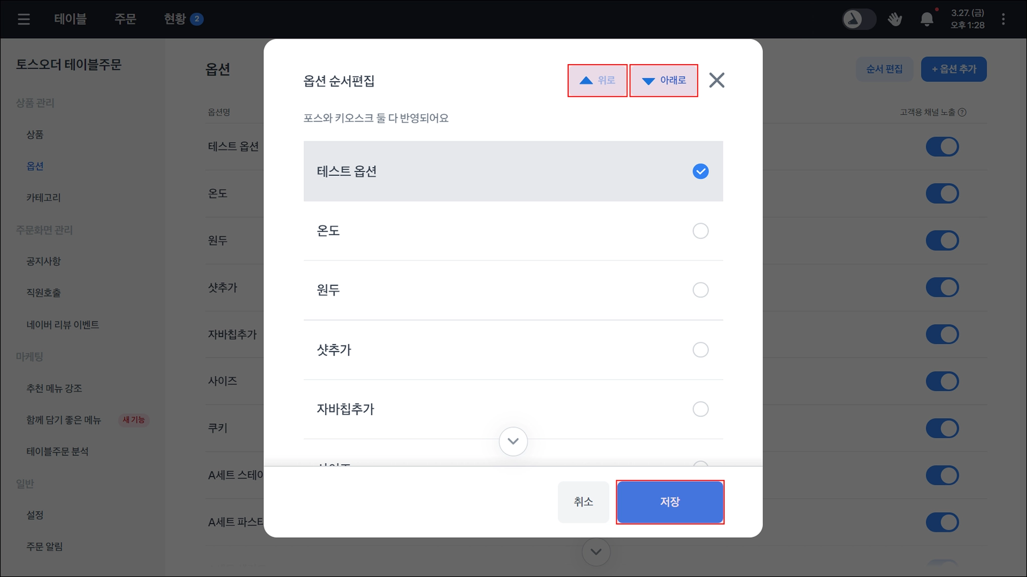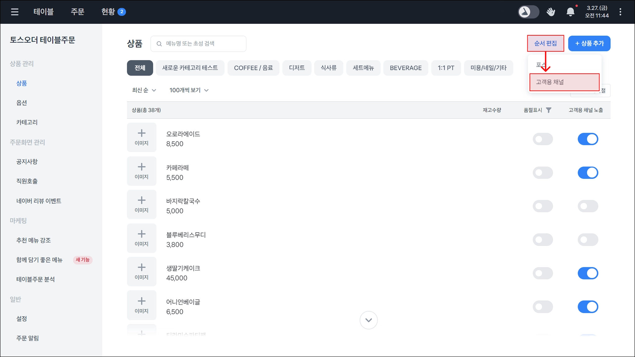 사장님용 포스 화면과 매장 손님용 고객 채널에서 보이는 상품 순서를 각각 다르게 설정할 수 있어요.