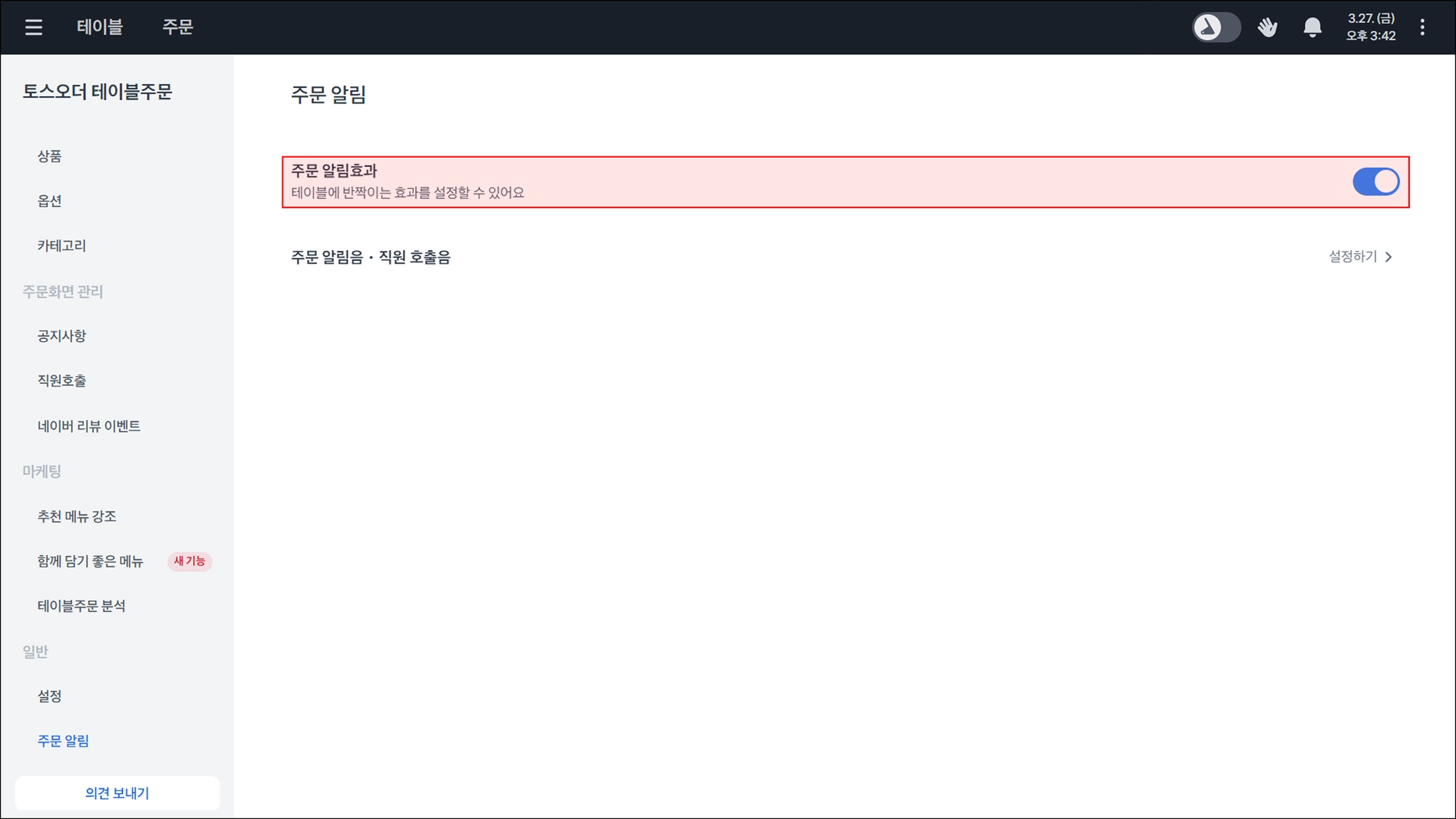 토스포스 왼쪽 상단 ≡ → 테이블주문 → 주문 알림 → 주문 알림 → 주문 알림효과 버튼을 활성화 해주세요.