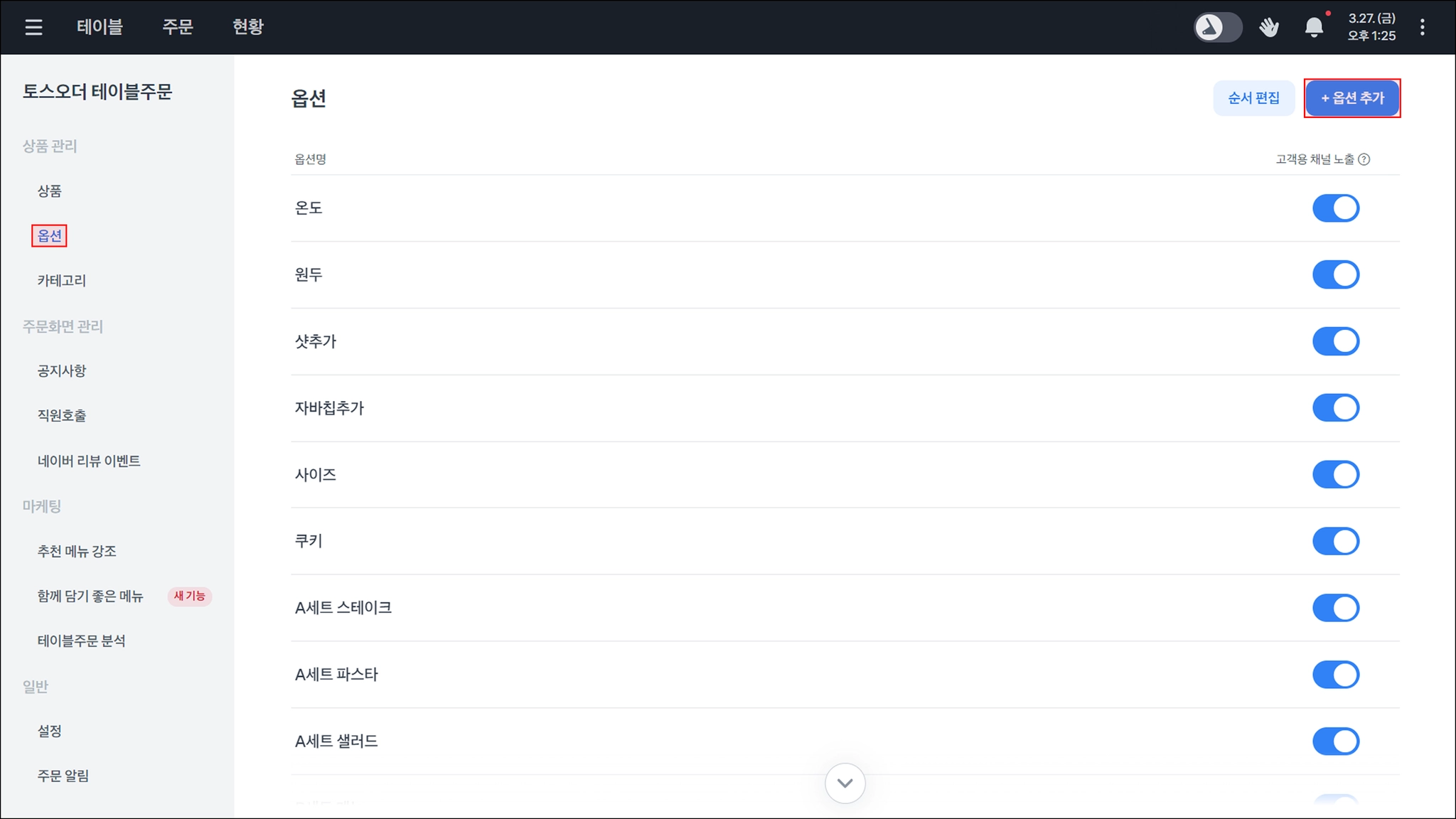 토스포스에서 옵션을 등록/수정할 수 있어요.