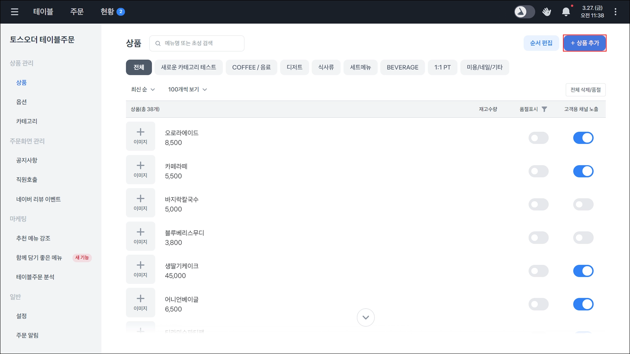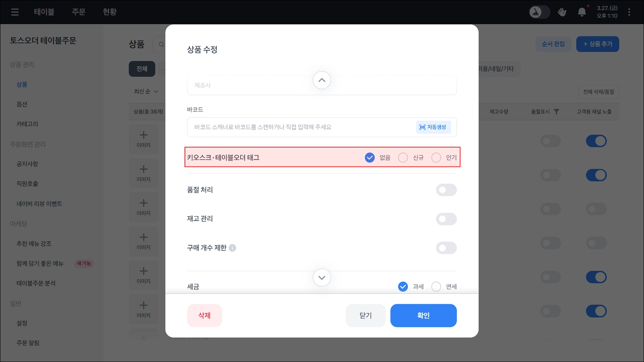 토스오더 테이블 주문에서도 상품을 삭제 또는 품절/품절해제 등록을 할 수 있어요.