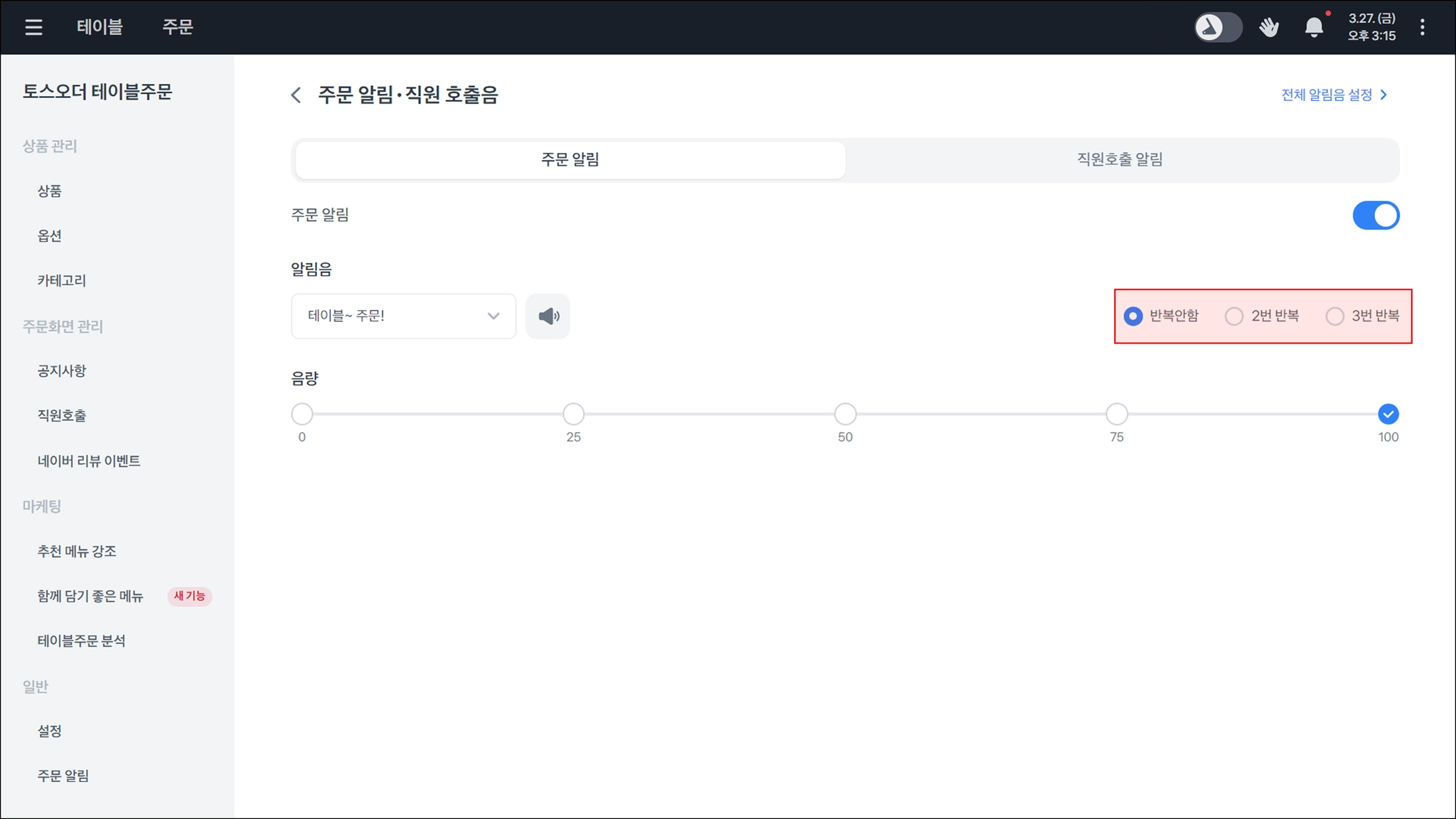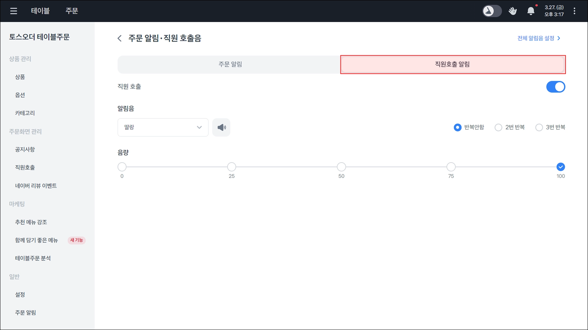 토스포스 왼쪽 상단 ≡ → 테이블주문 → 주문 알림→ 주문 알림음 · 직원 호출음을 누르면 설정을 하실 수 있어요.
